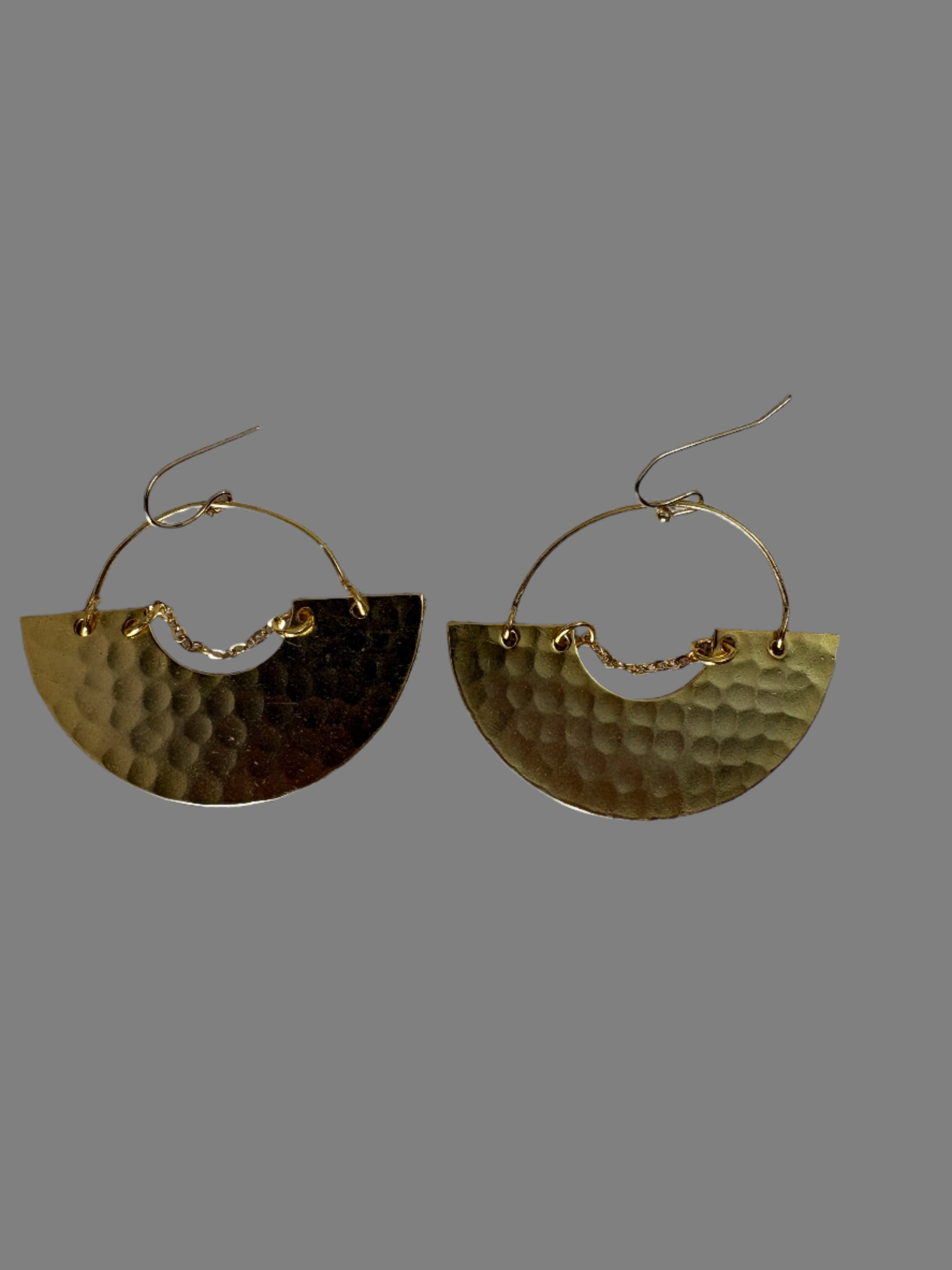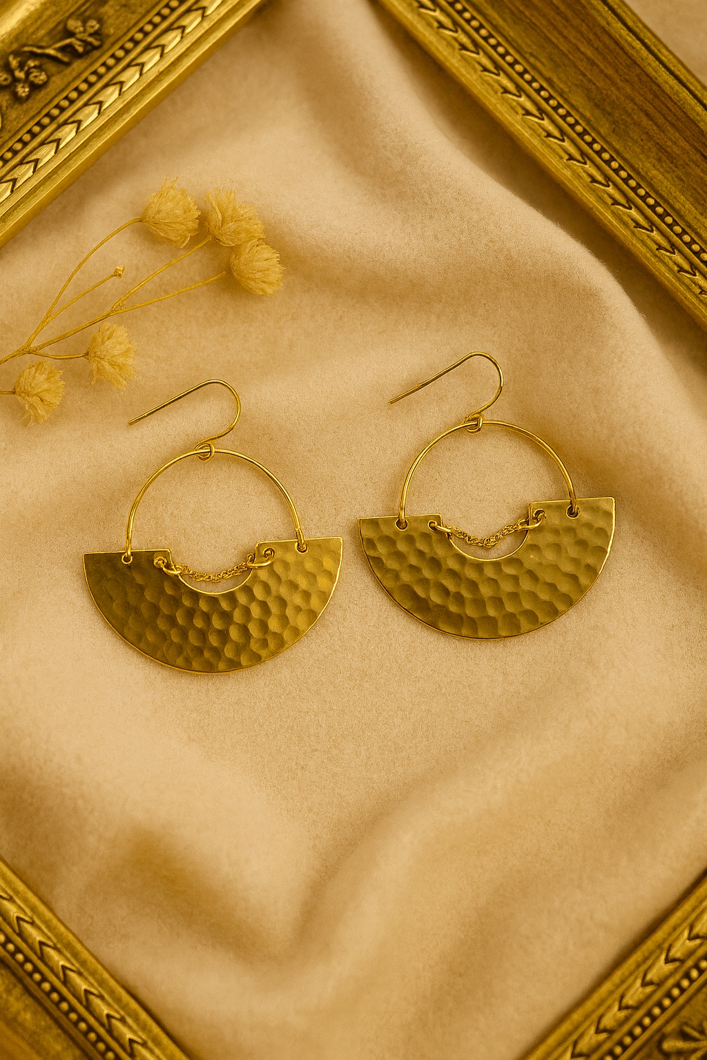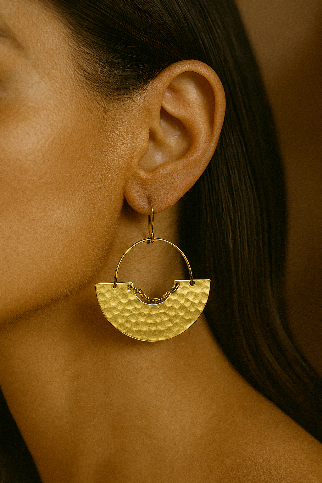 These AARA earrings feature a distinctive hammered half-moon design, meticulously handcrafted from brass and finished with luxurious 18K gold plating. Their expert craftsmanship ensures durability and a refined aesthetic, making them a sophisticated addition to any jewelry collection.