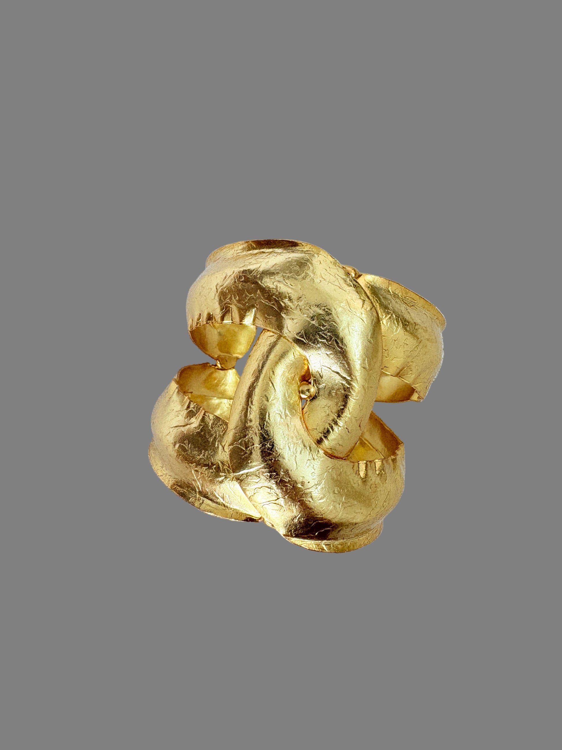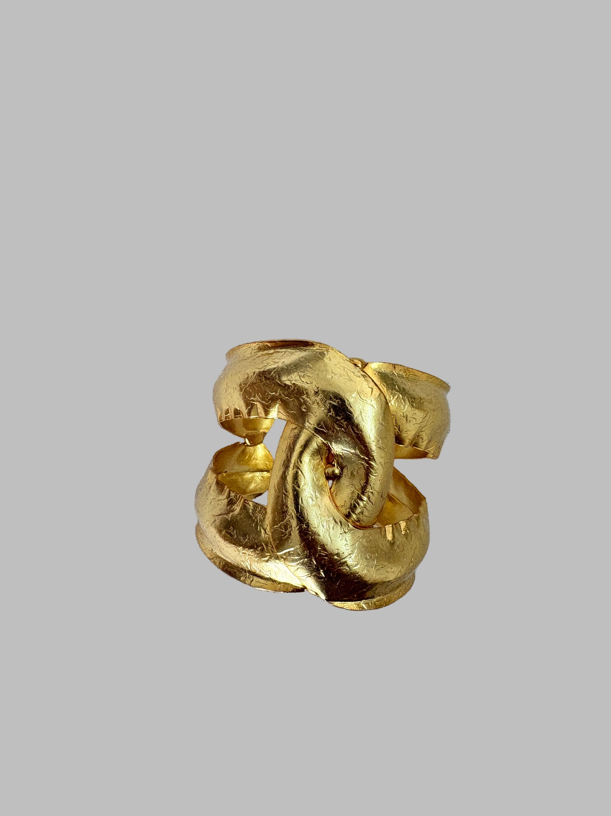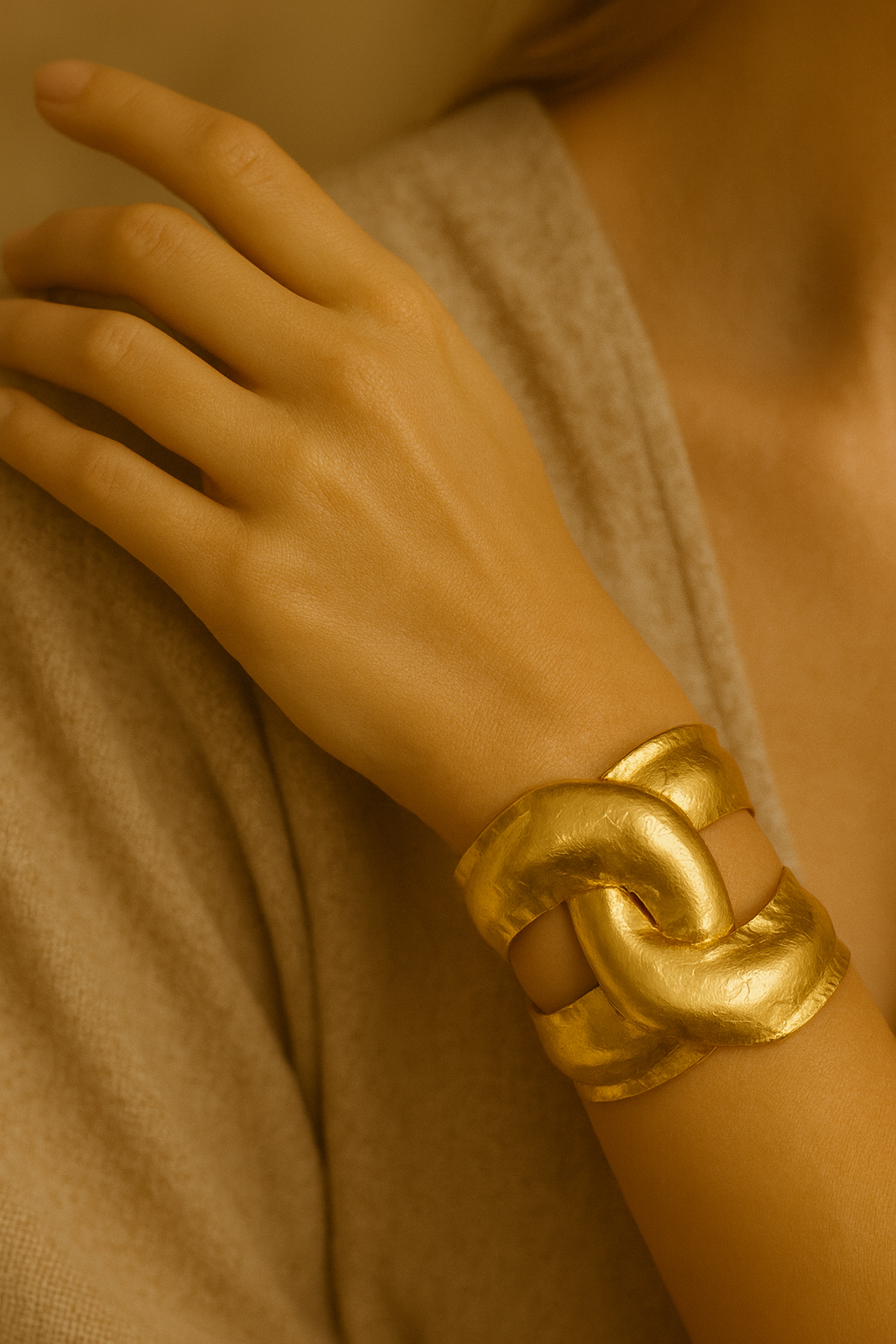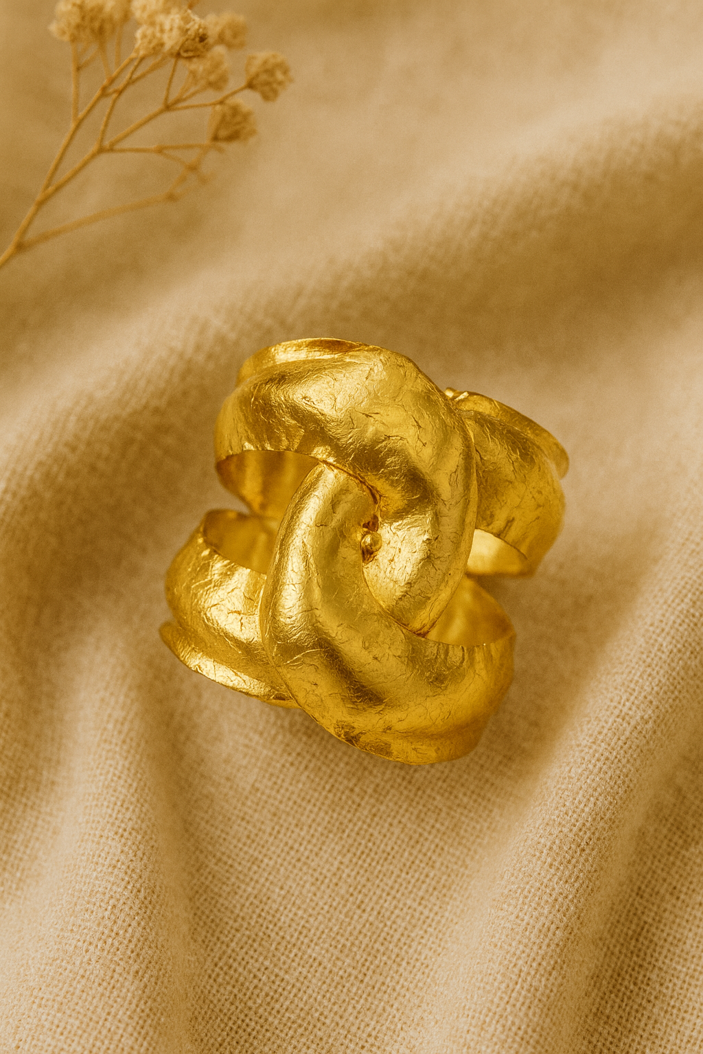Adaa Cuff – A statement molten-textured gold cuff designed with an artistic knot silhouette, symbolizing strength and elegance. Its bold yet fluid form wraps the wrist in a warm golden glow, making it the perfect piece to elevate both festive and contemporary looks.