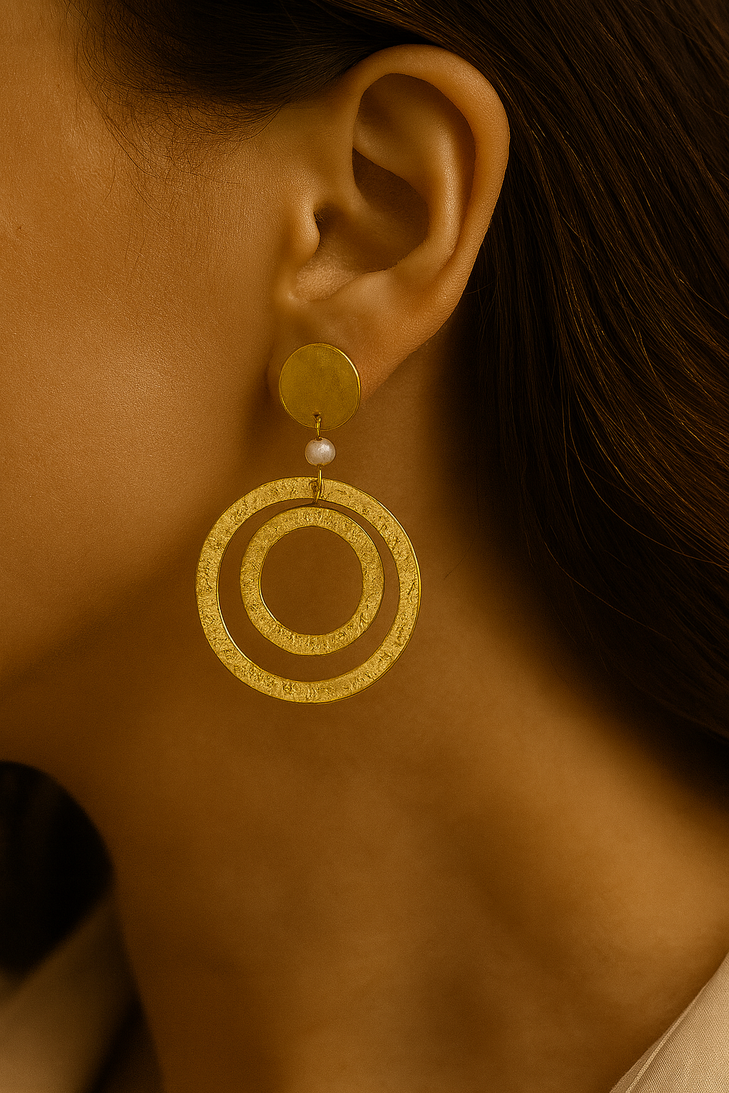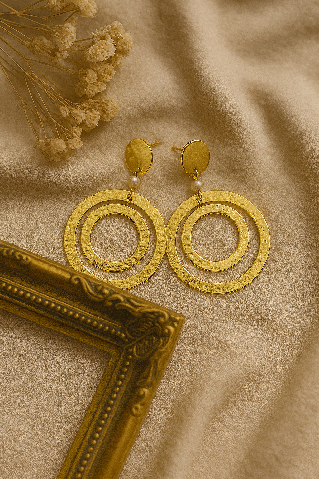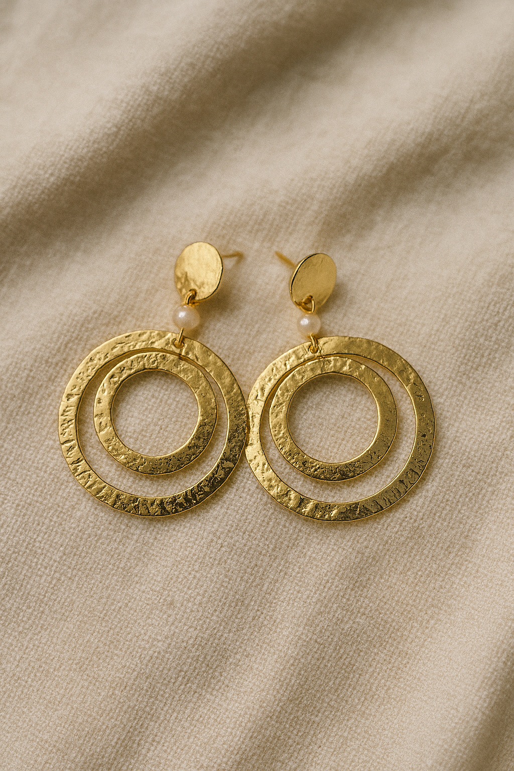 Brass-crafted, 18K gold-plated double hoop earrings with a molten hammered texture, accented by a delicate pearl detail. Lightweight yet bold, perfect for adding an artisanal luxe touch to any outfit.