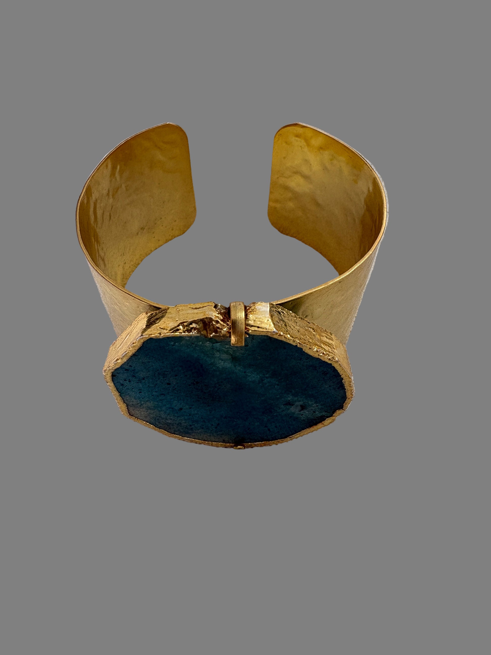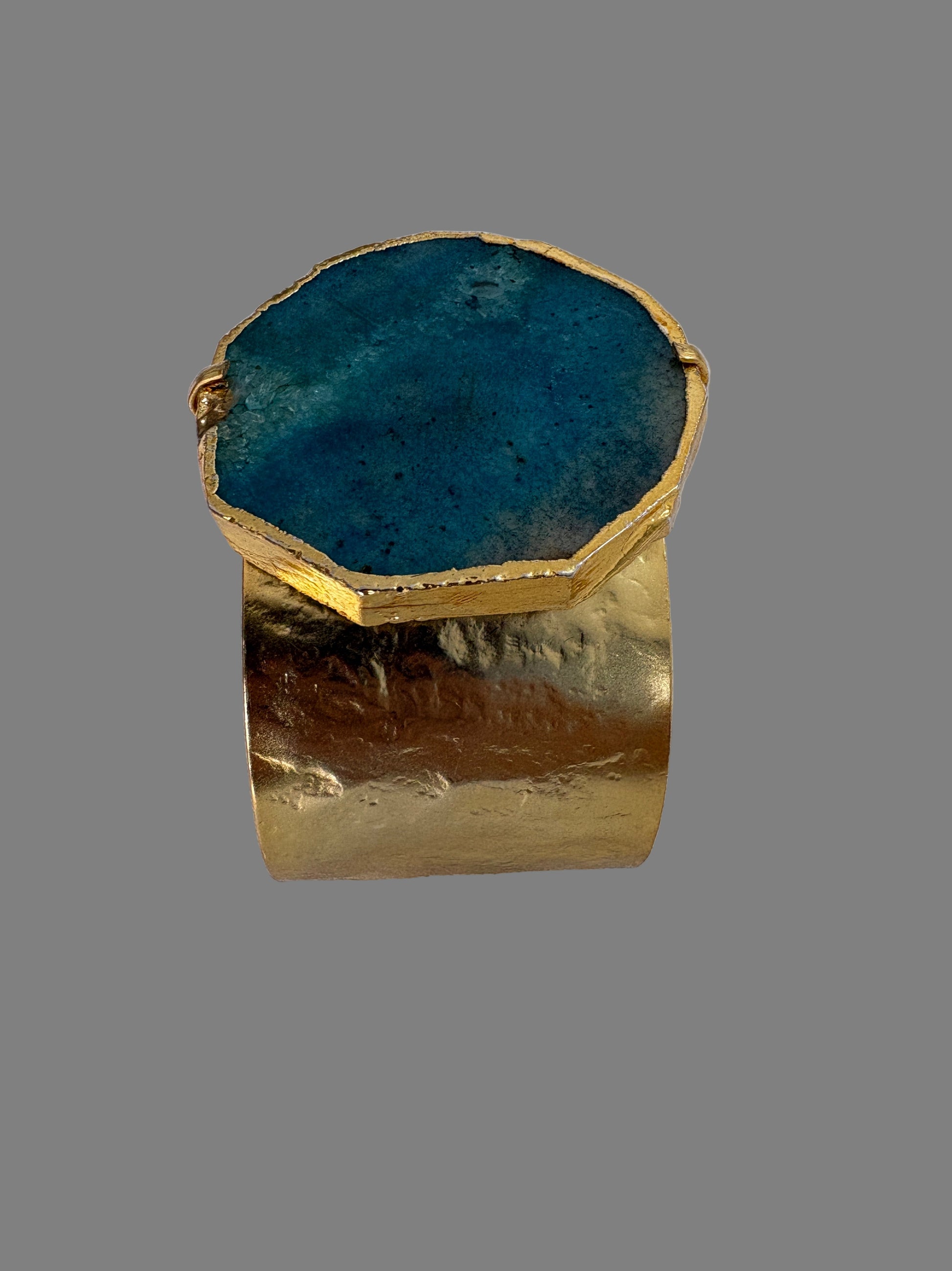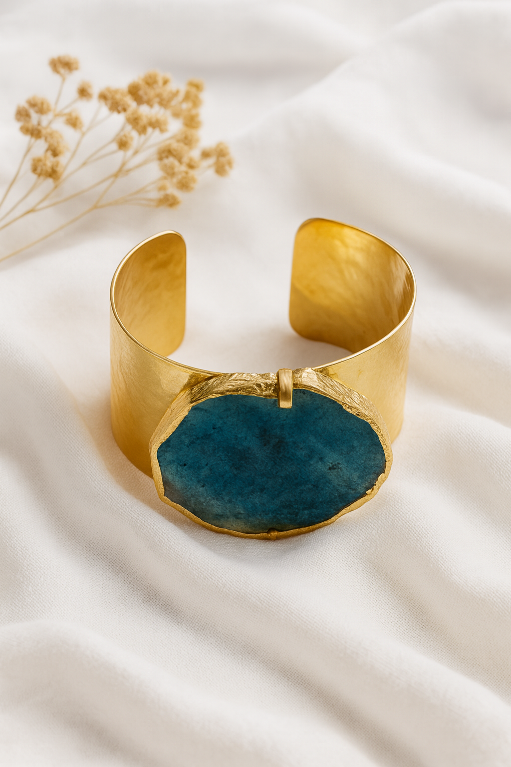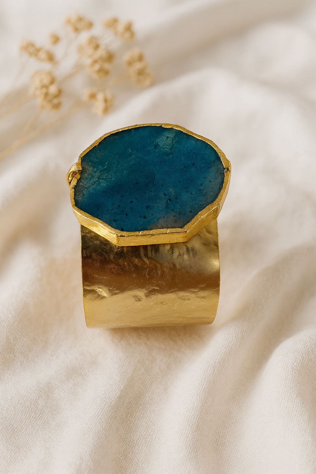 Aqira – A bold statement of elegance, crafted in hammered brass with 18k gold plating, featuring a striking raw blue agate stone centerpiece. Each stone carries its own unique texture and depth, making every piece one of a kind. Perfect to elevate resort wear, evening looks, or everyday luxe styling.