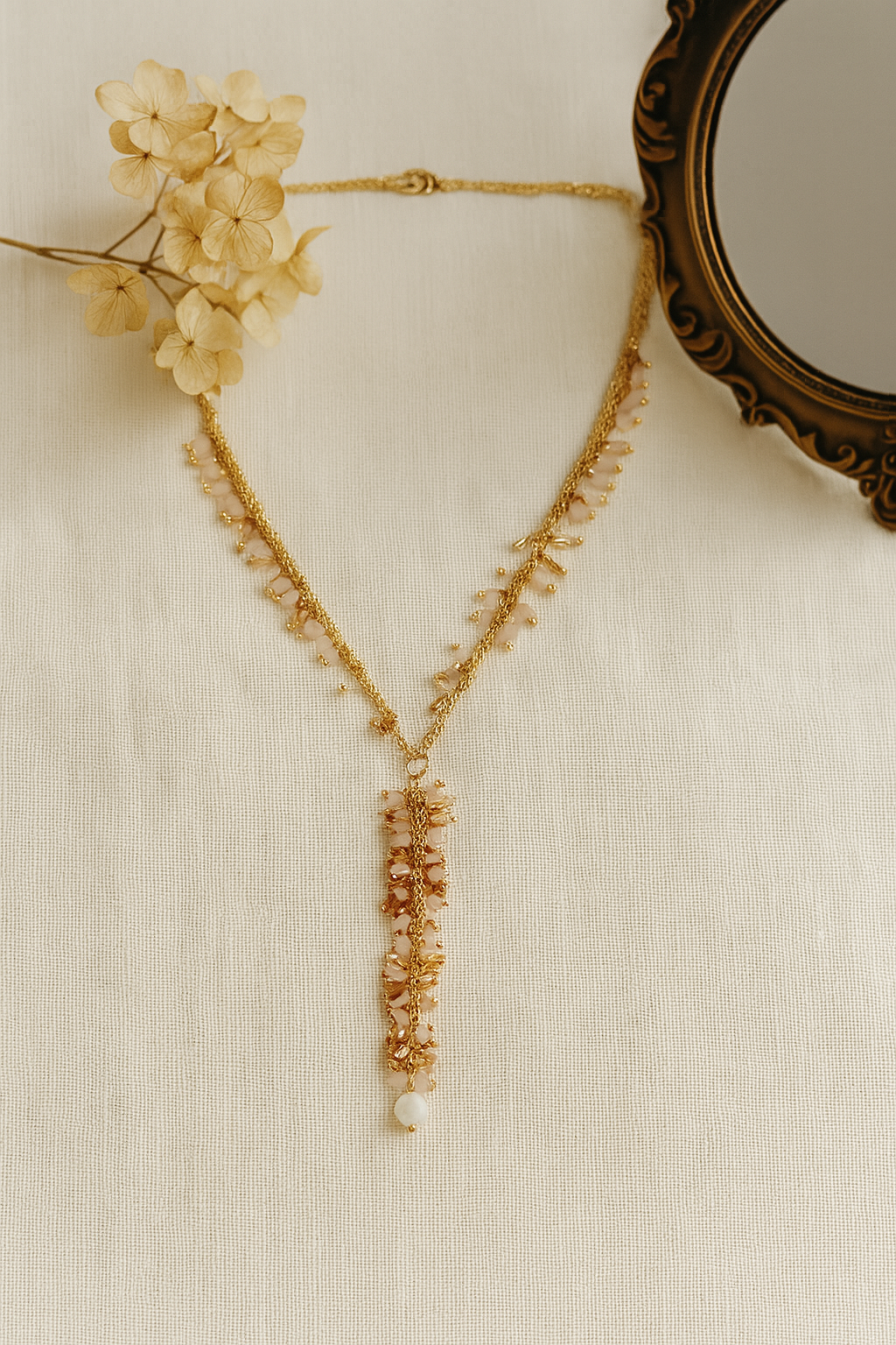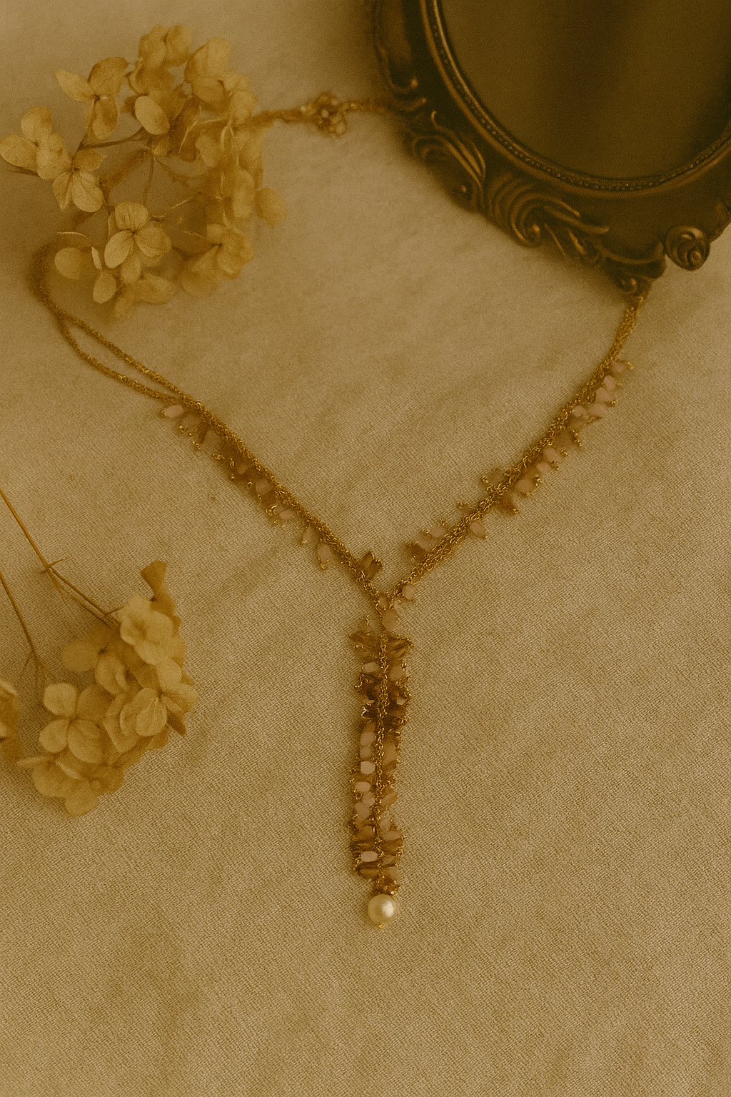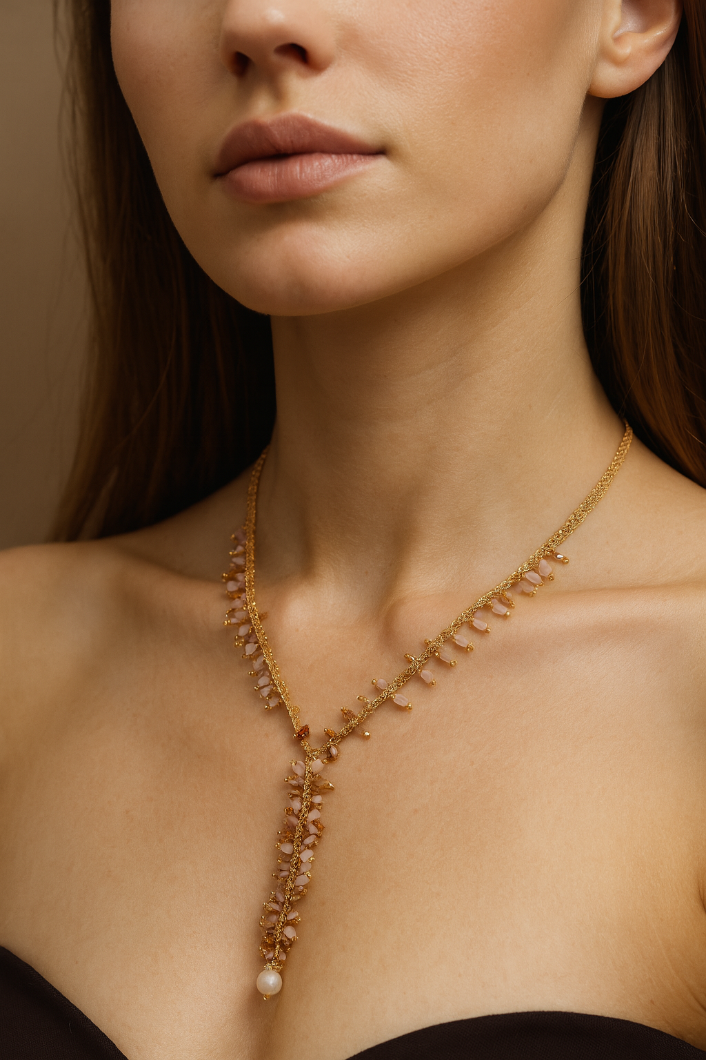 A delicate Y-shaped necklace adorned with soft blush crystal beads, warm toned accents, and a single lustrous pearl drop. Crafted in brass with 18k gold plating, this piece captures the glow of the first morning light, adding a graceful shimmer to any look.