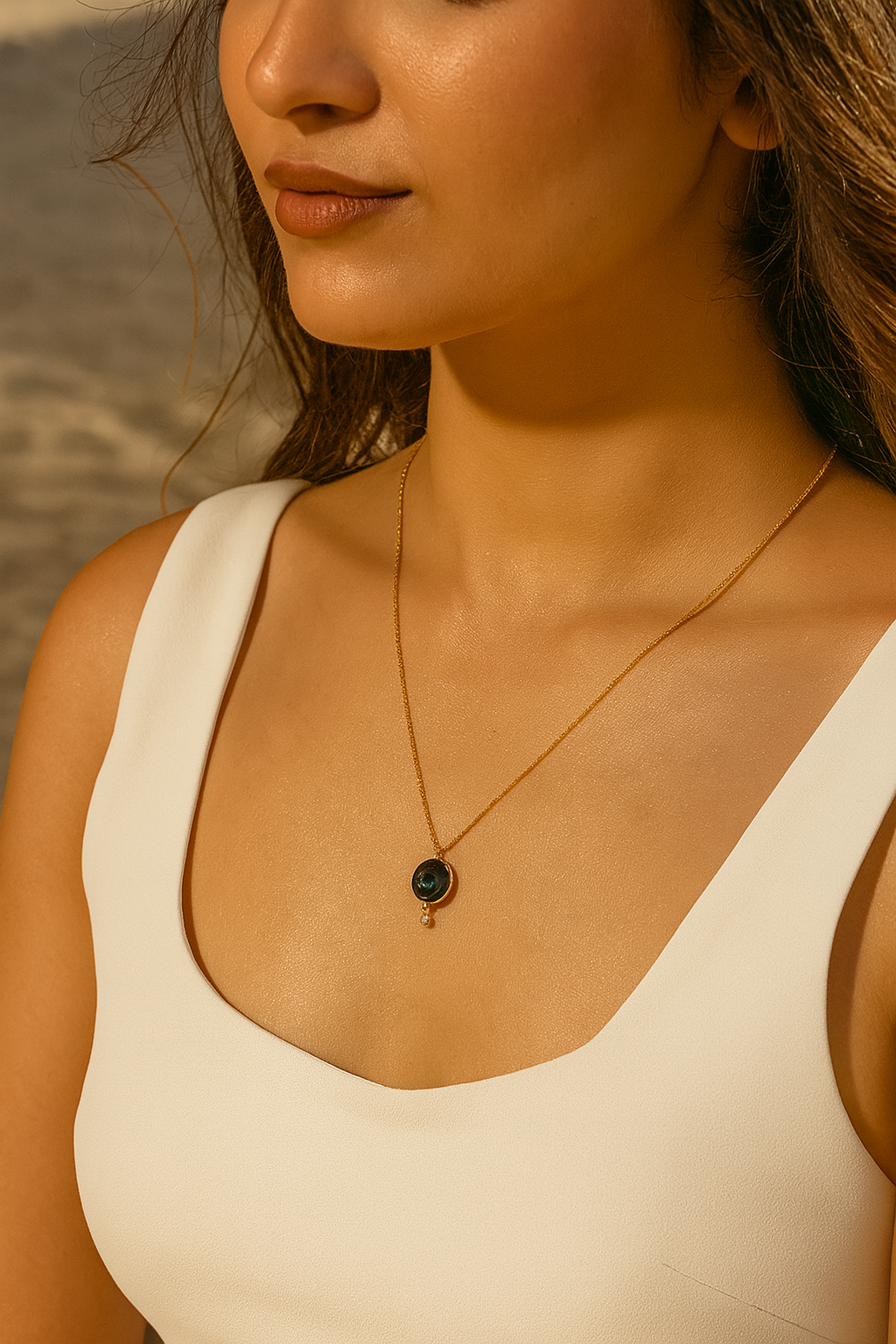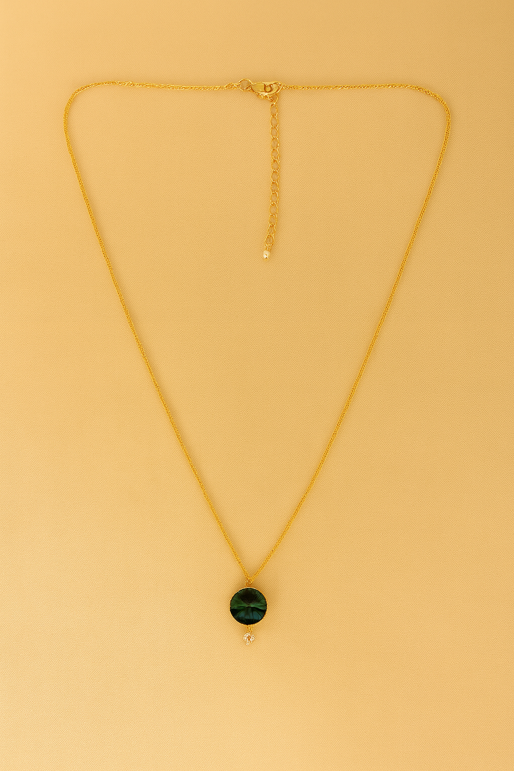 Avira is a refined Swarovski emerald necklace on a delicate brass chain, designed to exude timeless elegance perfect for casual outings or glamorous parties.