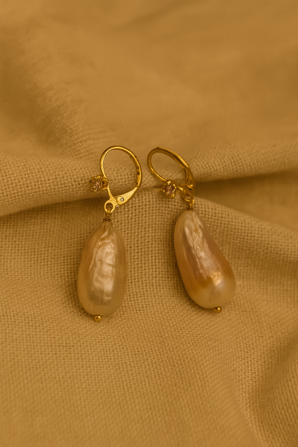 Uneven baroque pearls paired with a stone-set fish hook, crafted in brass with 18k gold plating. Each piece is one-of-a-kind, just like you.