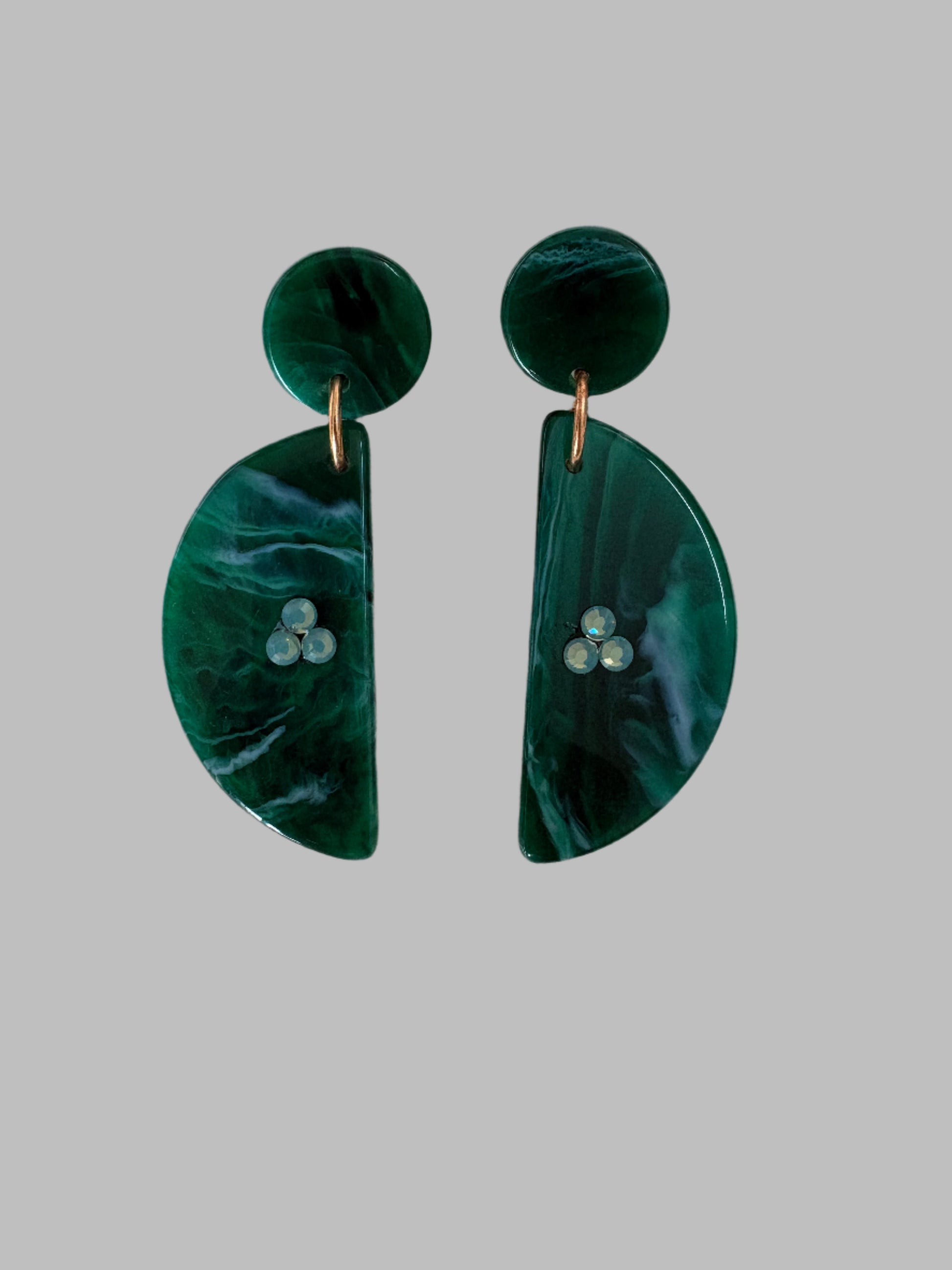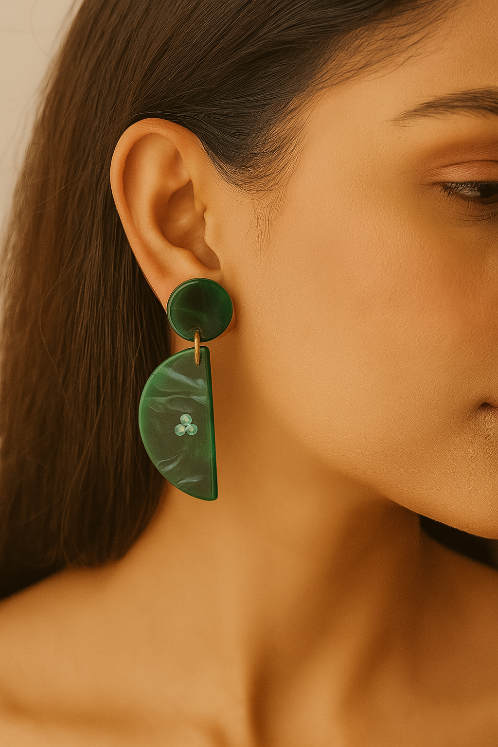 These Chandira earrings feature green resin half-moon drops with intricate detailing, designed to bring a vibrant accent to white and neutral outfits. Their lightweight construction ensures comfortable wear, while the modern design offers a refined, chic aesthetic suitable for both casual and formal occasions.