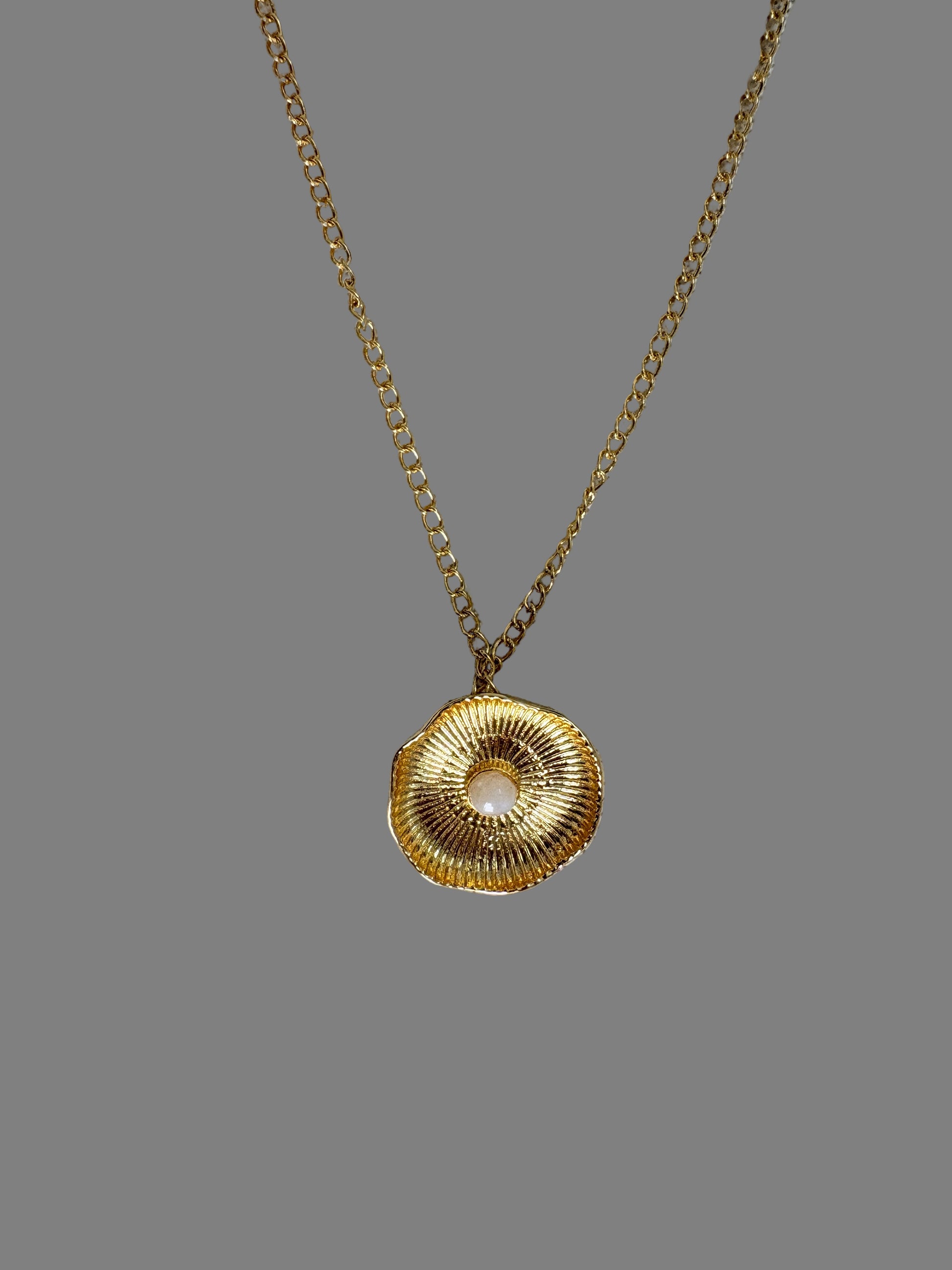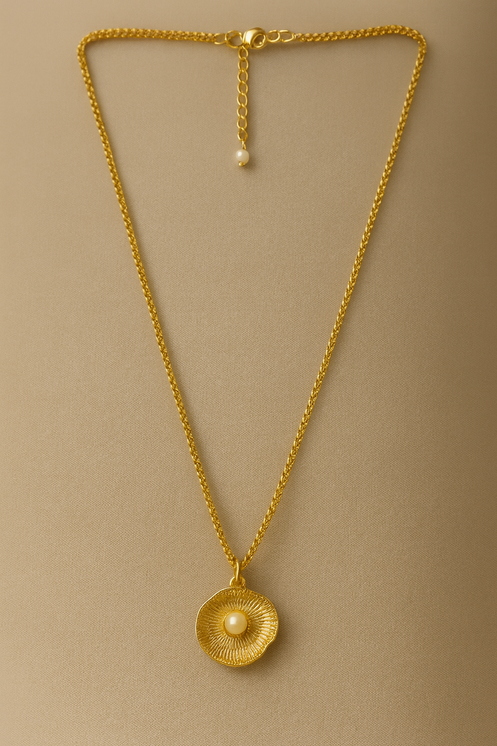 A golden bloom brought to life a graceful flower-petal design with a lustrous pearl nestled at its heart. Crafted in brass with 18K gold plating, this piece captures the elegance of nature in a timeless, wearable jewel, perfect for adding a touch of radiant charm to any look.