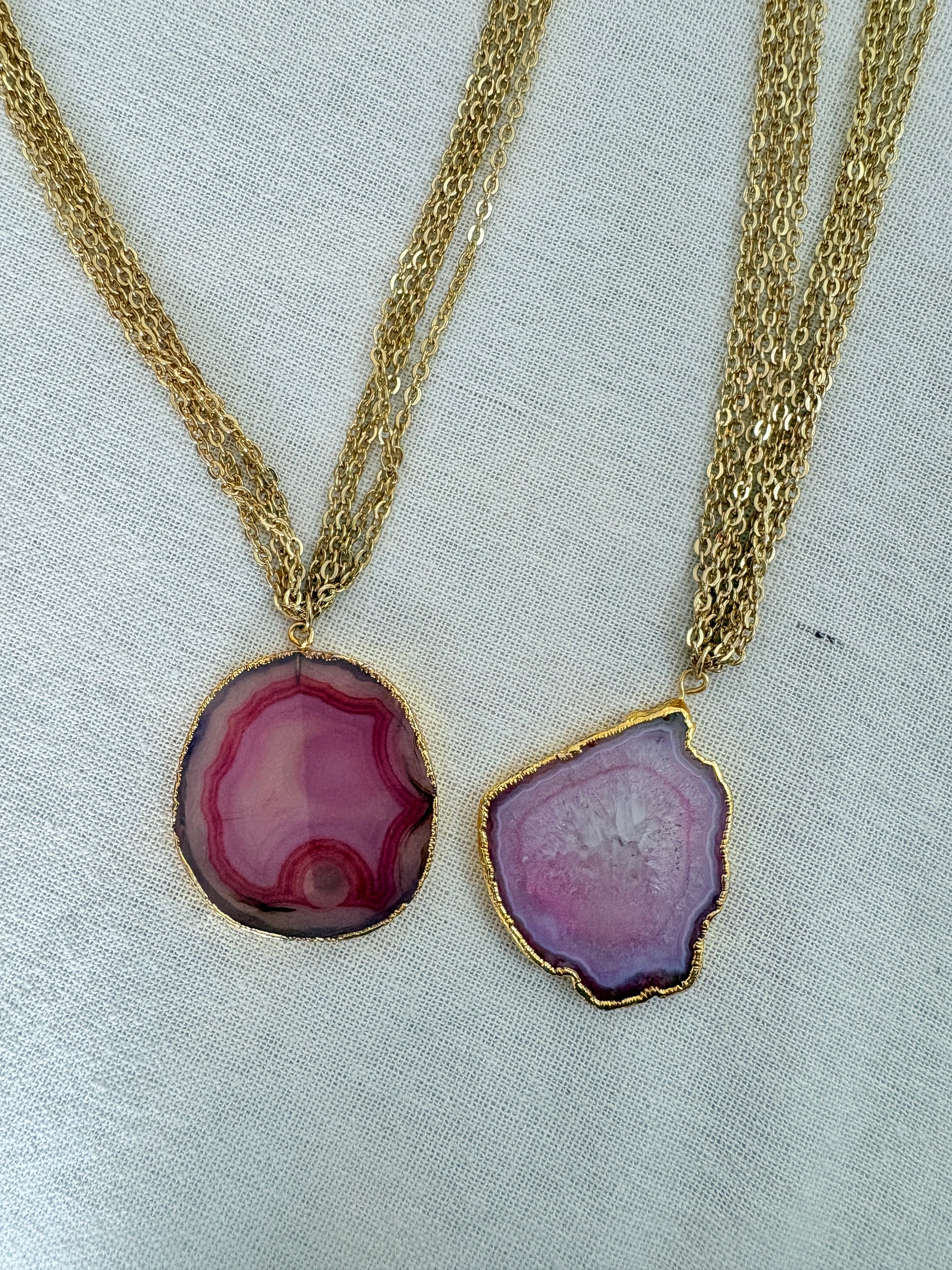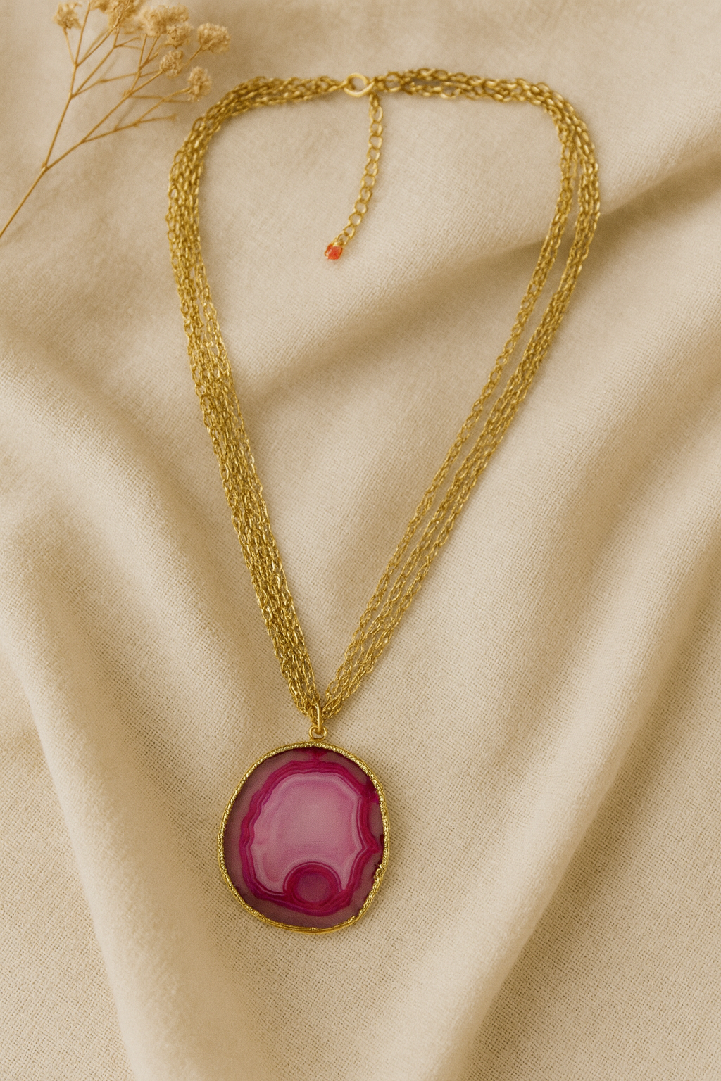 Bold and beautiful, Gulaira features a striking pink agate slice framed in radiant 18K gold plating, suspended from three delicate gold-plated brass chains for a layered luxe effect. The vibrant stone adds a pop of color and charm, while the warm gold tones bring an elegant balance.
