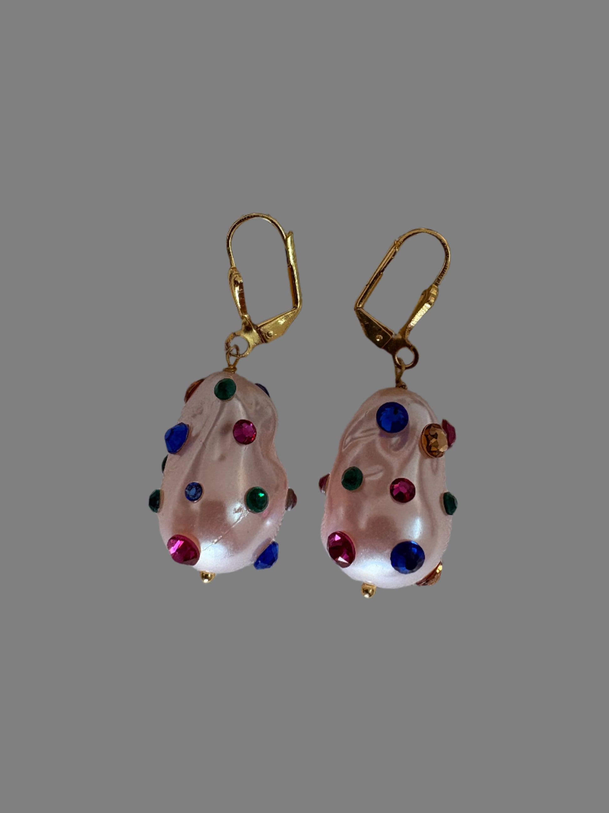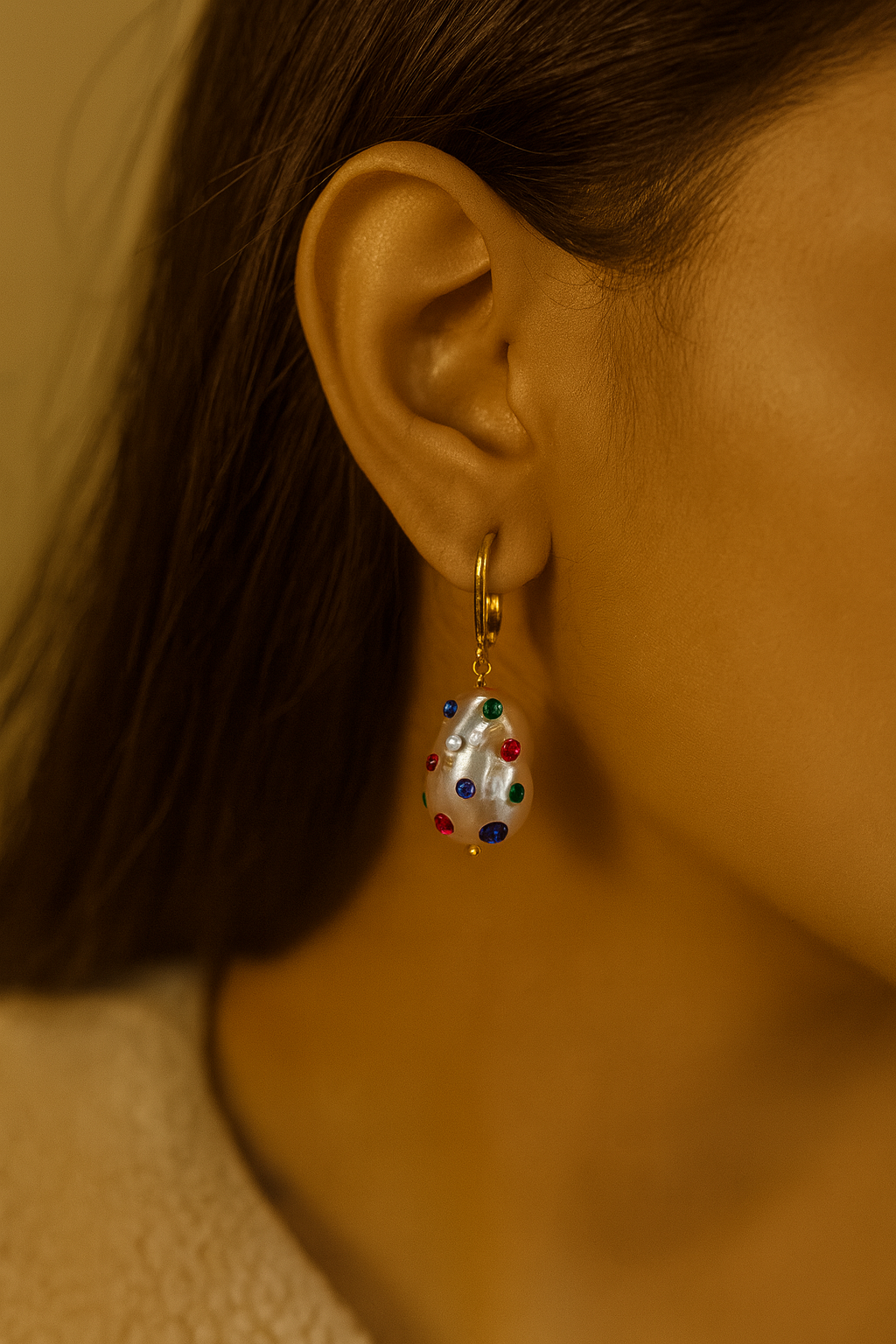 Handcrafted baroque pearl earrings adorned with precision cut Swarovski stones, set in 18K gold plated brass. A perfect blend of organic elegance and refined sparkle, designed to turn every glance into admiration.