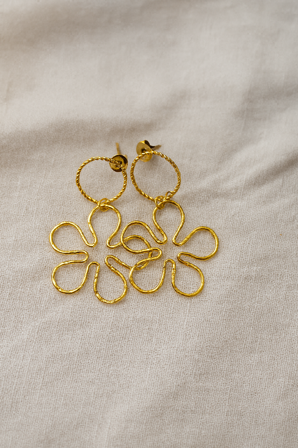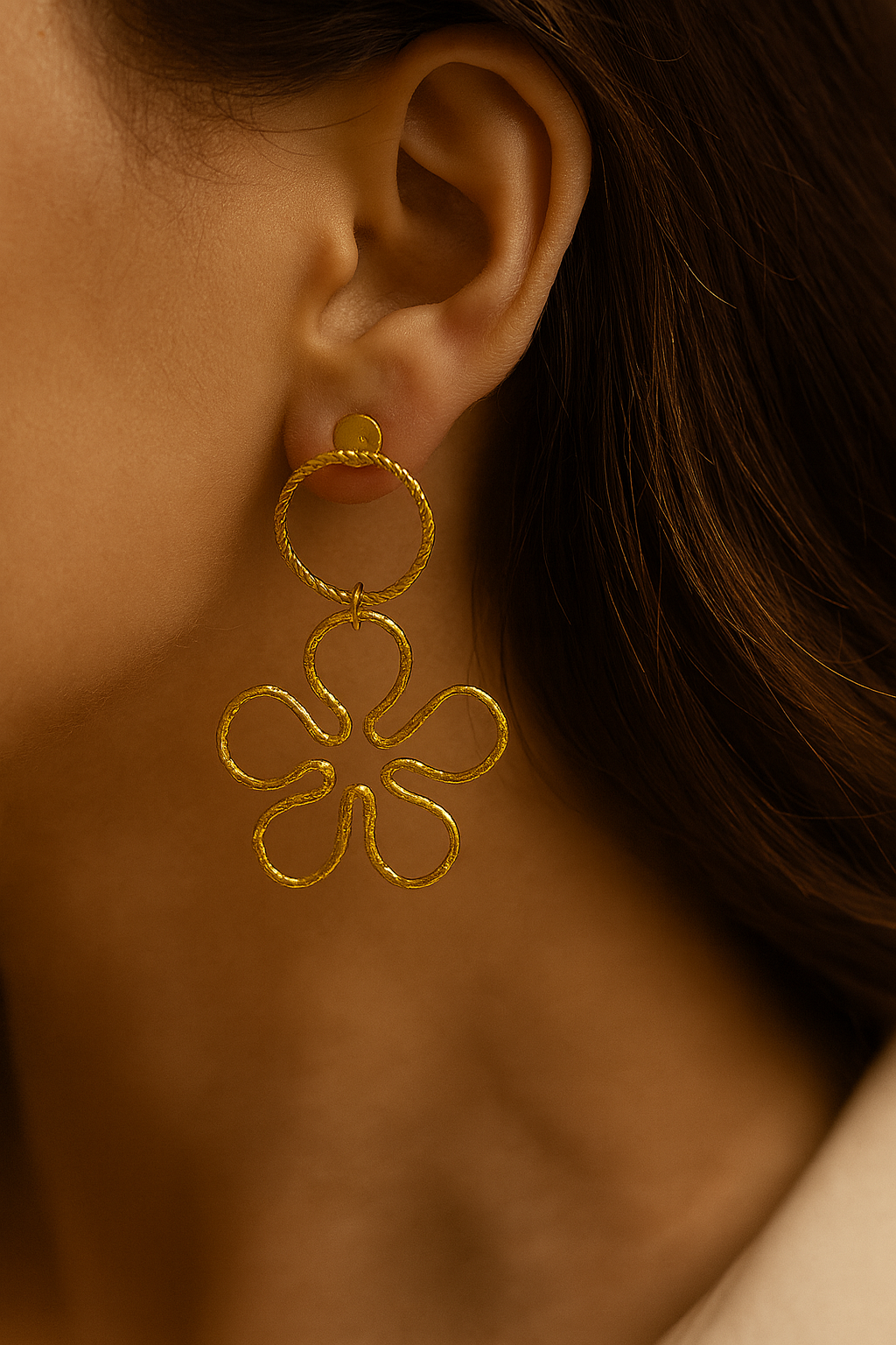 These KUSUM earrings are expertly crafted from brass and finished with an 18K gold plating, offering a luxurious floral design that elevates any outfit. Their lightweight construction ensures comfortable wear throughout the day, making them an ideal choice for adding a refined and fashionable accent to your look.