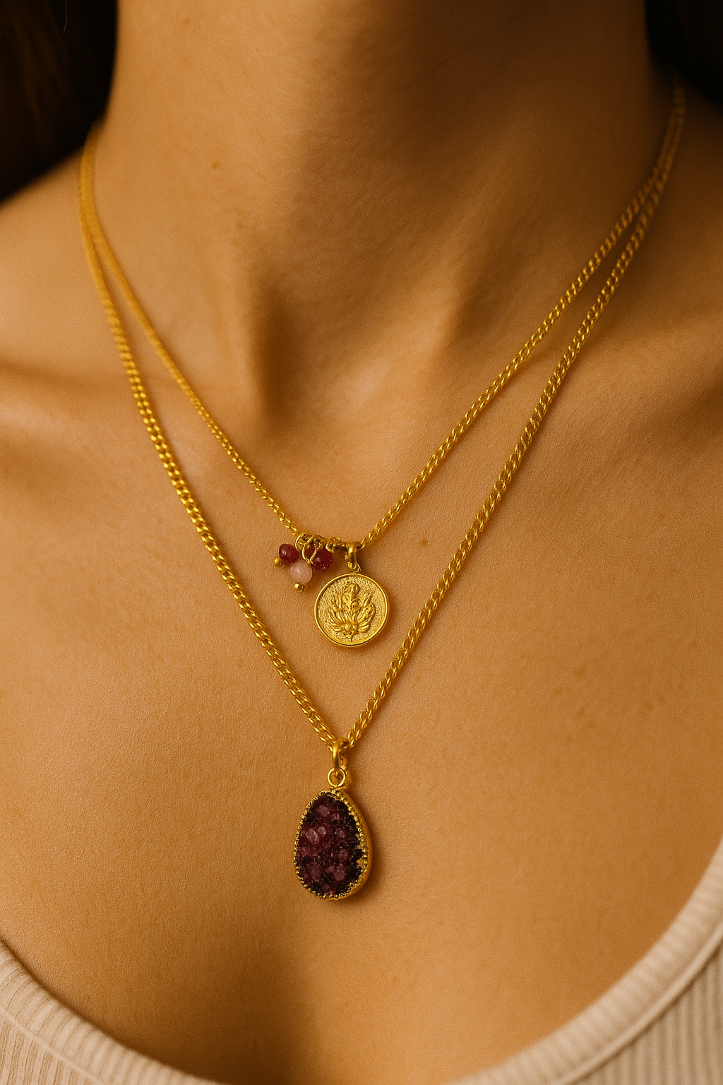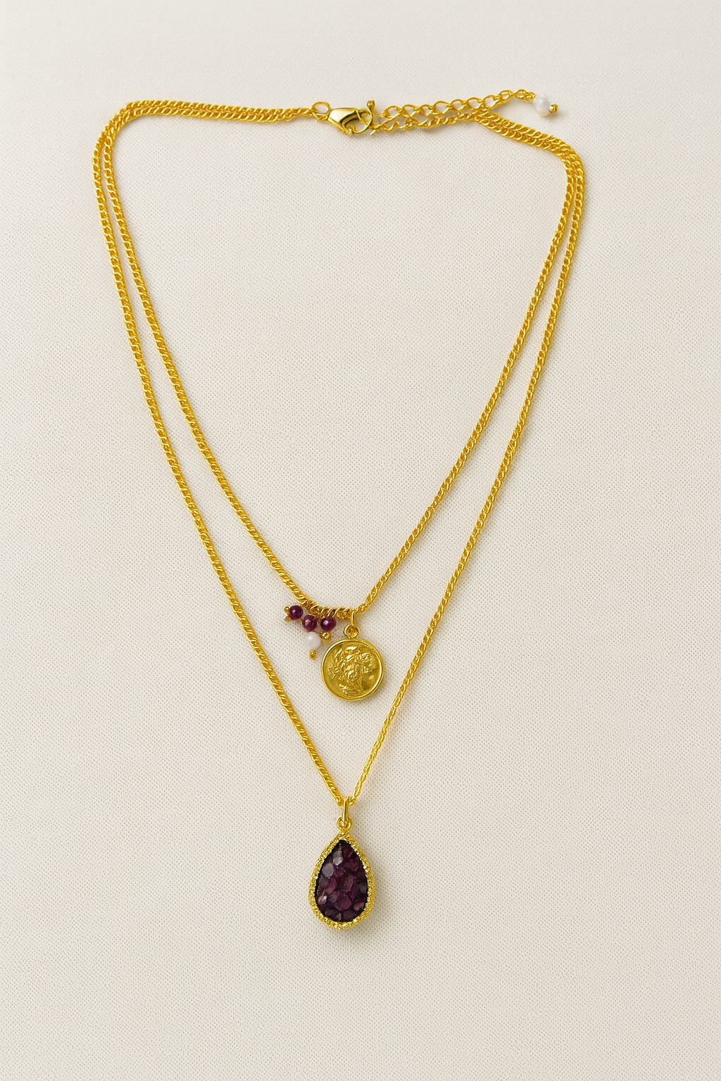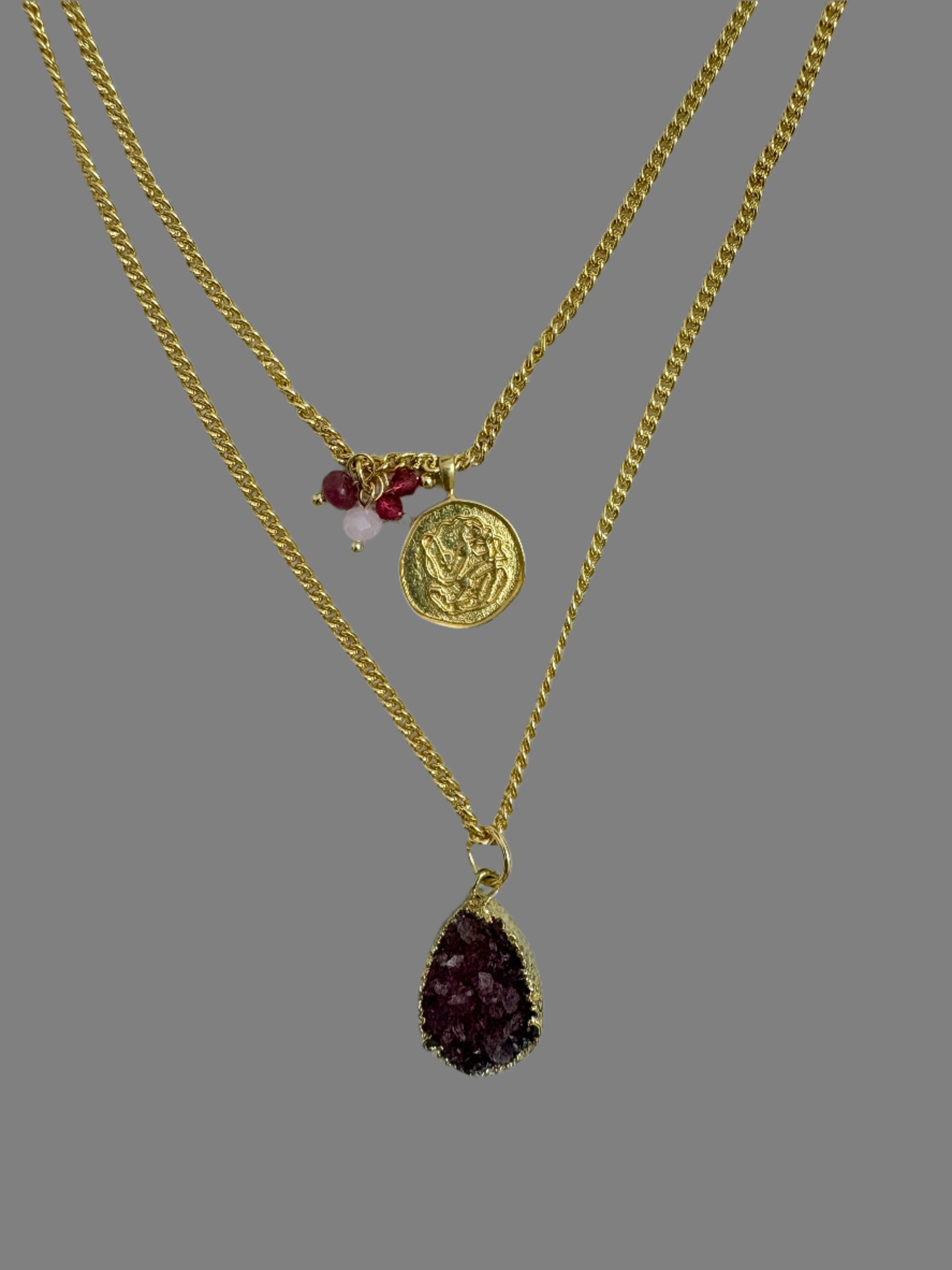 Manira is a graceful two layer necklace featuring a gleaming gold coin charm paired with a deep wine-hued semi-precious stone pendant. Crafted in brass with 18K gold plating, it blends timeless elegance with a hint of regal charm.