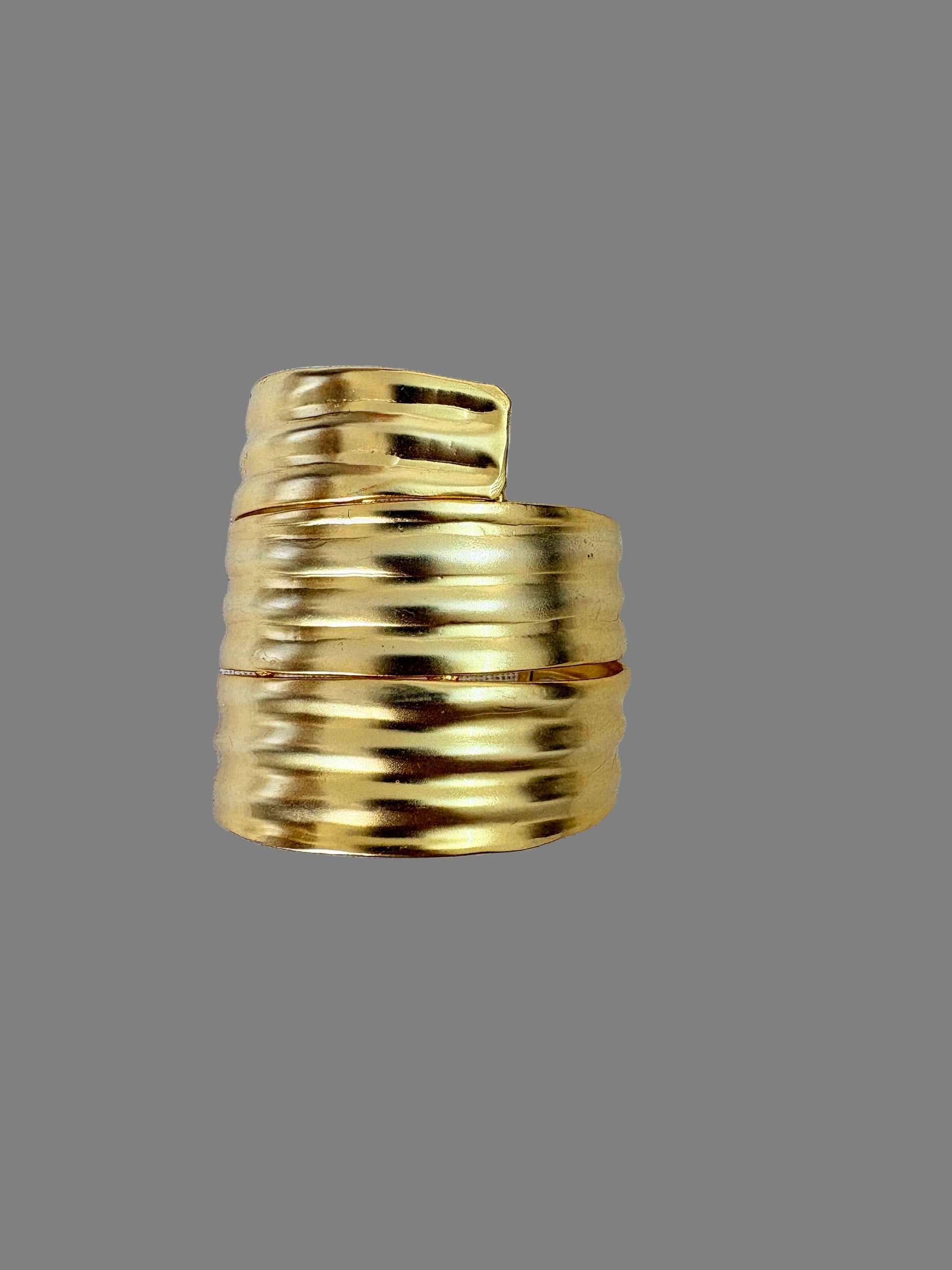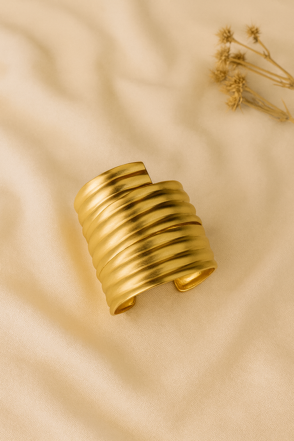 Nazm Cuff – A poetic statement handcrafted in brass with a molten gold finish. The ribbed texture flows like verses in rhythm, giving the cuff depth and sculptural elegance. Bold yet timeless, it’s a versatile piece that adds effortless grace to both contemporary and festive looks.