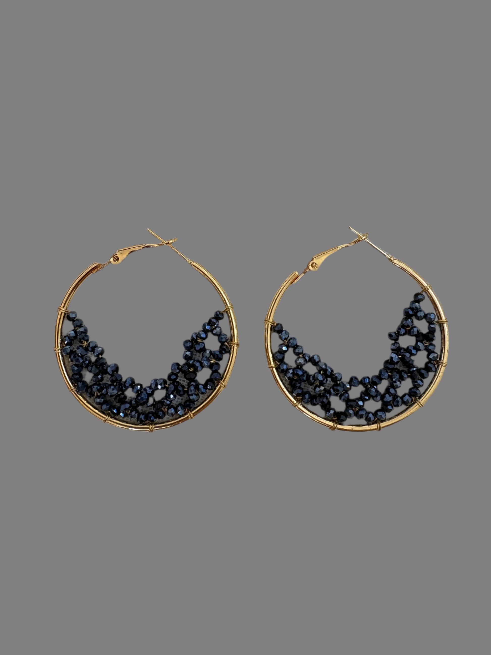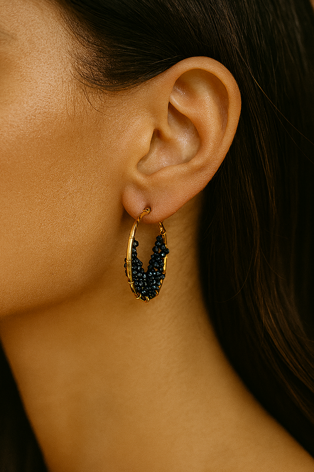 These NOIRA earrings feature expertly handcrafted brass hoops, plated with 18K gold for a luxurious finish. Adorned with faceted blue crystals, they offer a refined sparkle while the anti-tarnish coating ensures enduring shine and durability. Perfect for adding a sophisticated touch to any ensemble.