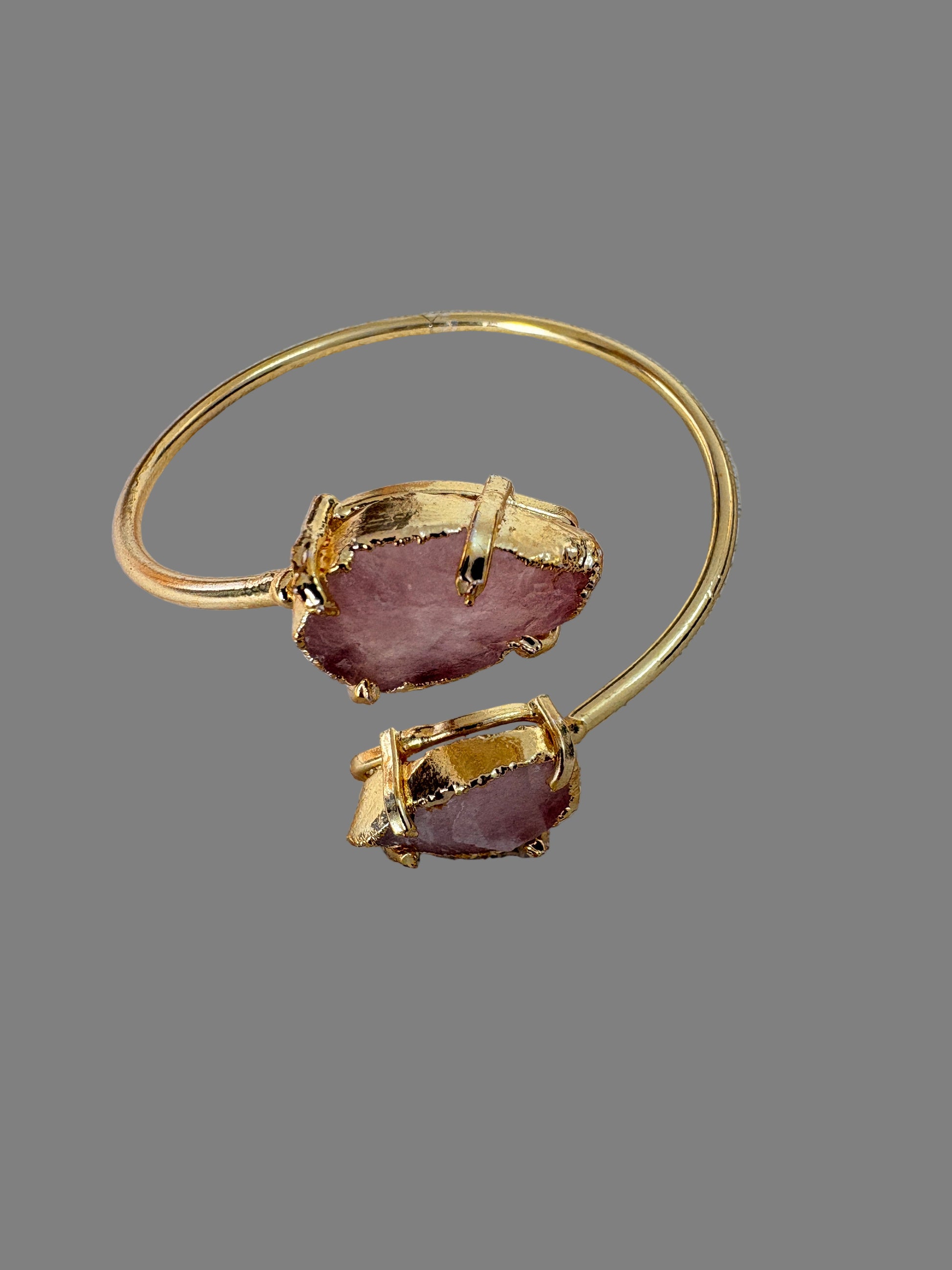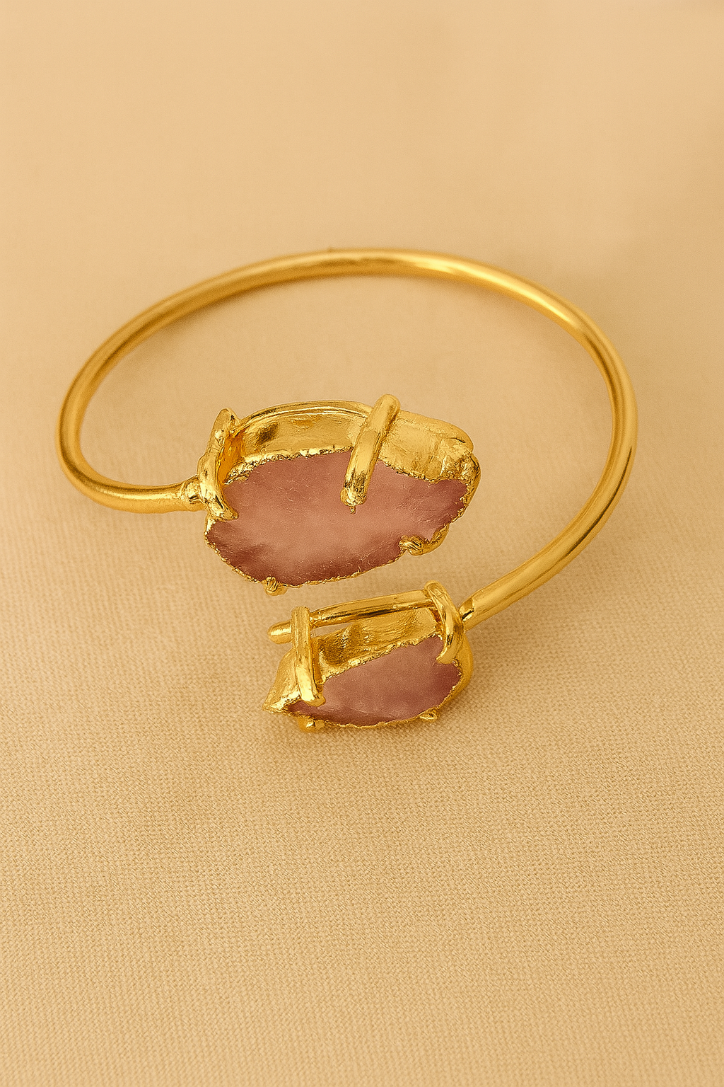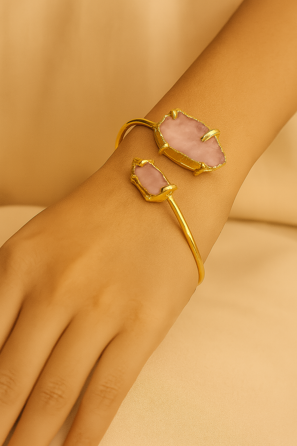 Rosavia – A delicate open cuff in molten gold, adorned with raw-cut pink semi precious stones that radiate soft femininity. Its organic form and blush tones make it a versatile statement, perfect for adding a touch of romance and luxe elegance to both daywear and evening ensembles.