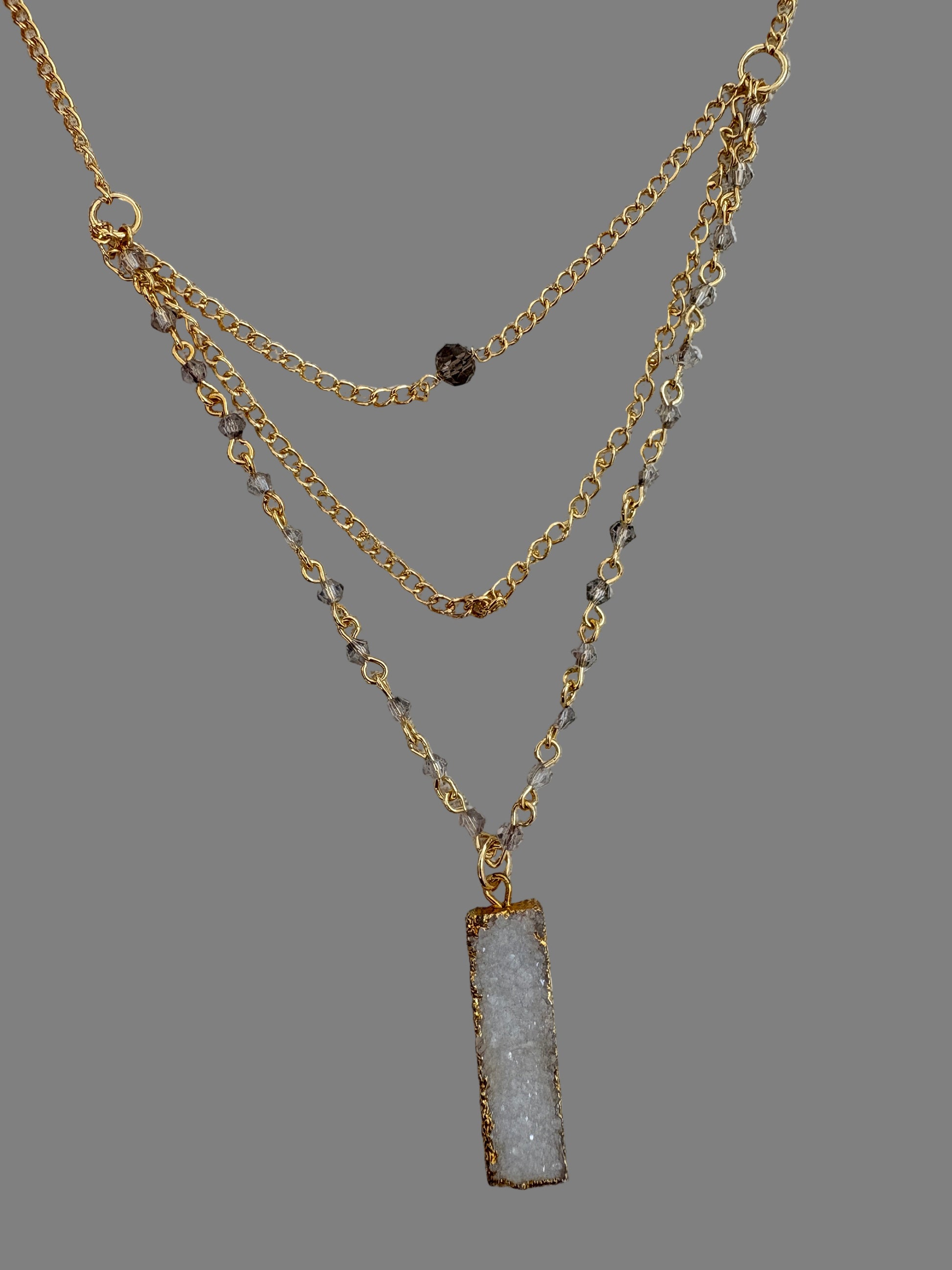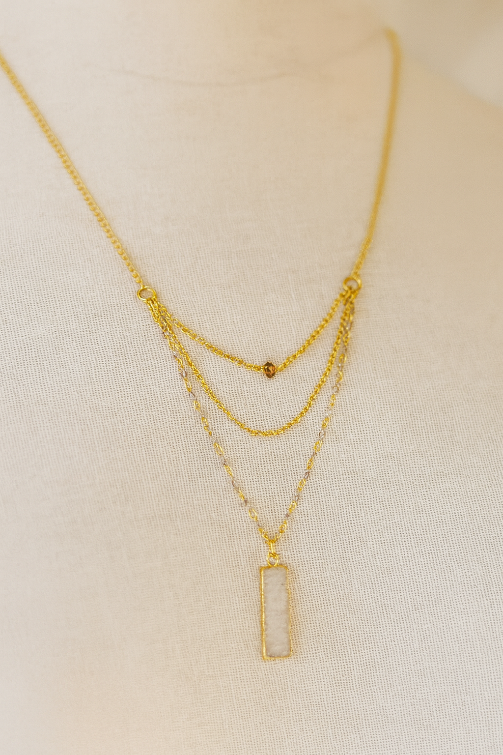 Minimal yet striking, Ruhira features delicate layered gold-plated chains, accented with a petite bead detail and a rectangular white stone pendant. Crafted from brass with 18K gold plating, it’s anti-tarnish, hypoallergenic, and light enough for everyday wear. The perfect blend of elegance and ease, this piece transitions effortlessly from day to night.