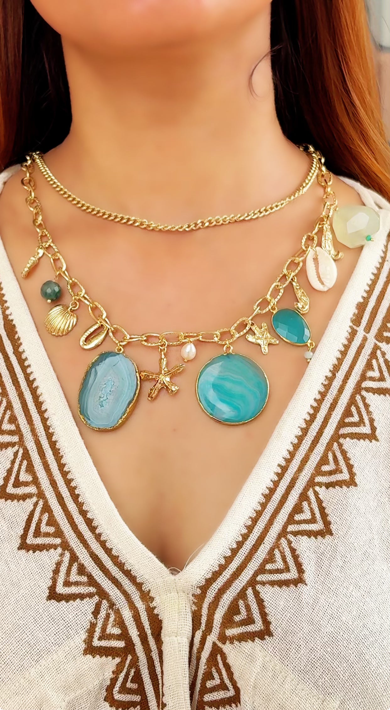 Sagarika – A luxe charm necklace that carries the essence of the sea. Featuring raw agate stones in serene ocean blues, paired with golden shells, starfish, and pearls, this piece is a blend of coastal beauty and timeless elegance. Perfect for resort wear, beach soirées, or adding a breezy statement to your look.