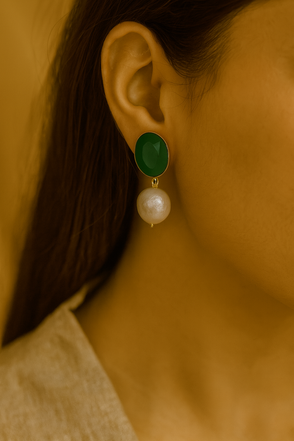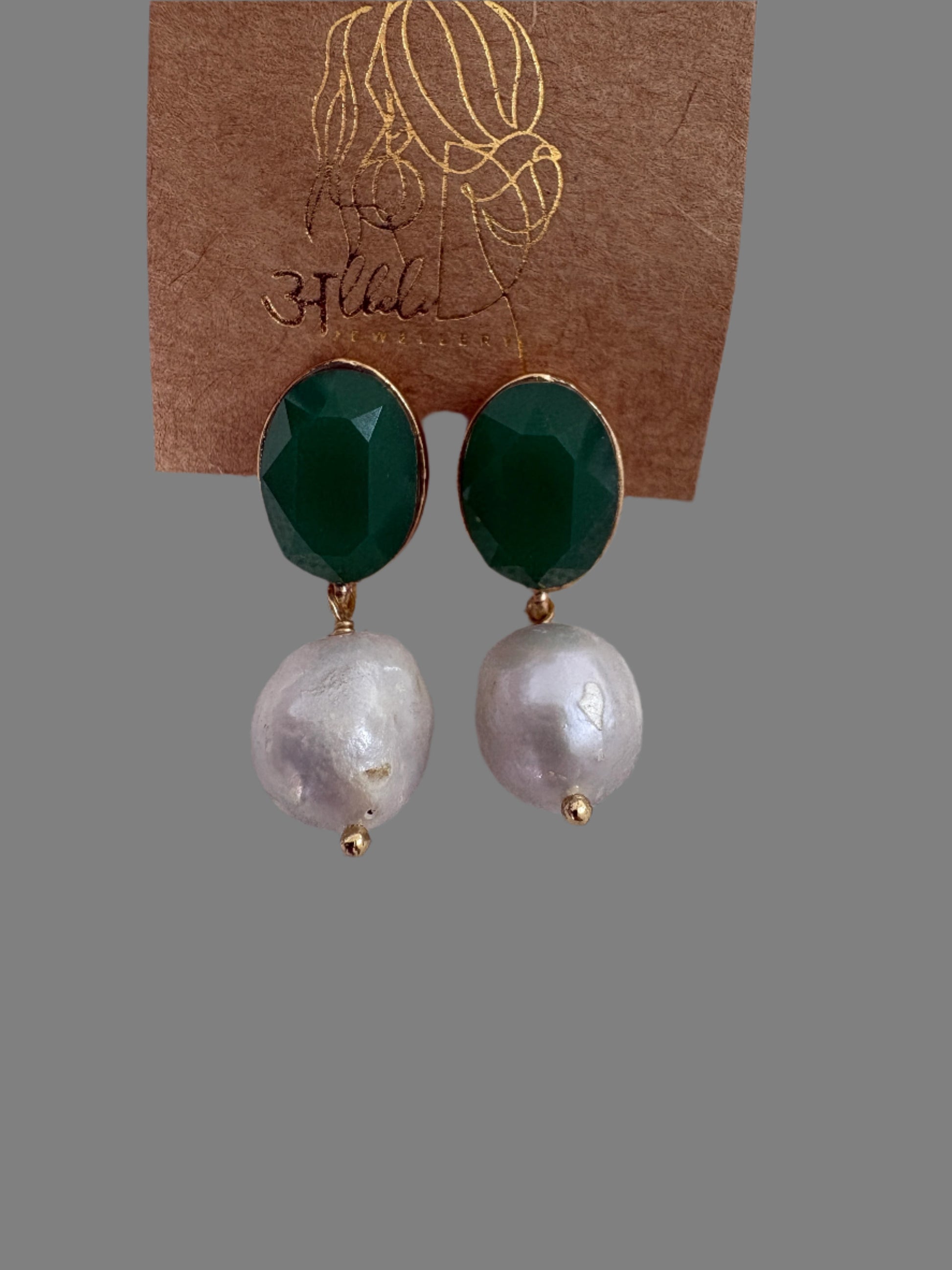 An exquisite pairing of deep emerald Swarovski stone and a luminous real baroque pearl, set in gold plated brass. Timeless elegance with a modern royal touch.