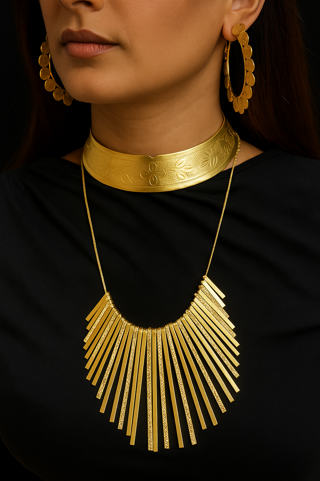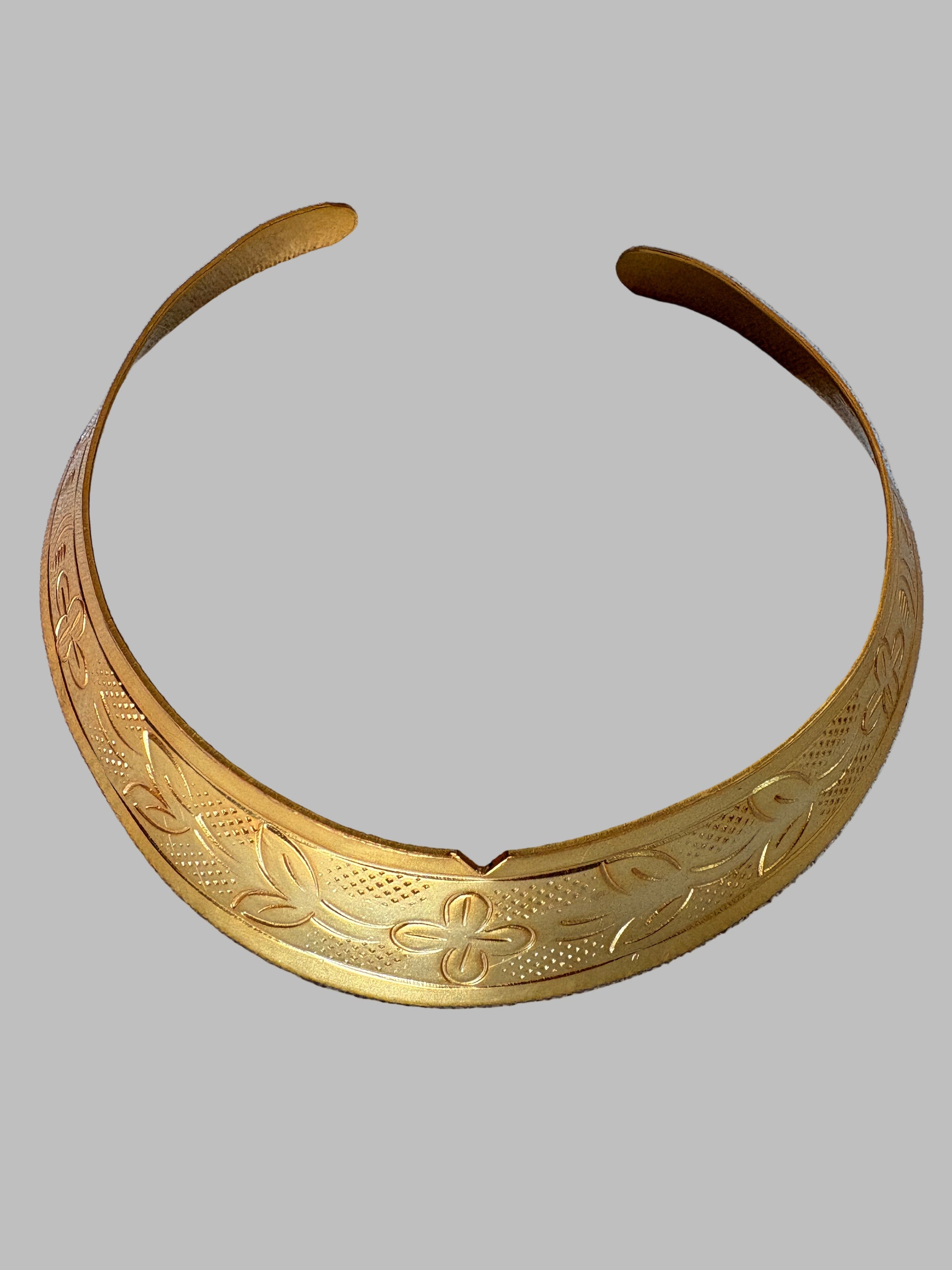 Tavira – A statement gold choker that captures the glow of sunlit elegance. Intricately engraved with delicate floral motifs, it wraps the neck in a warm, golden embrace. Perfect for pairing with resort wear, evening ensembles, or adding a luxe touch to minimal outfits.