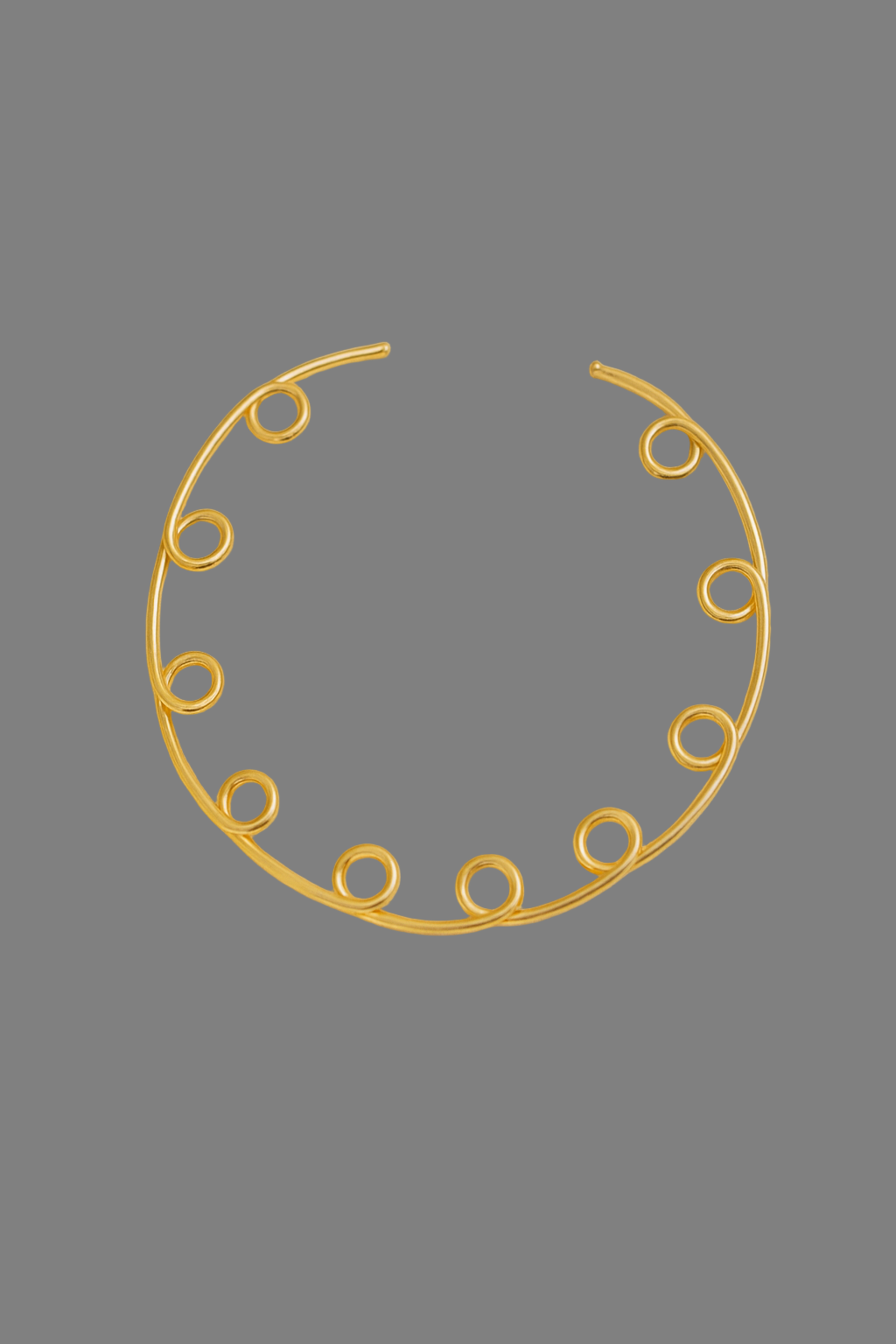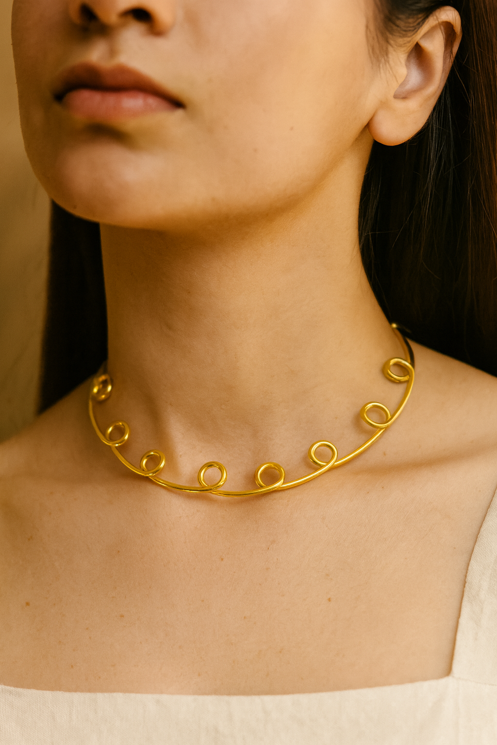 Elegant and contemporary, Vartika features a sleek twisted loop design in brass with radiant 18K gold plating. Lightweight, anti-tarnish, and hypoallergenic, this choker sits gracefully along the neckline perfect for adding a touch of modern sophistication to any look.