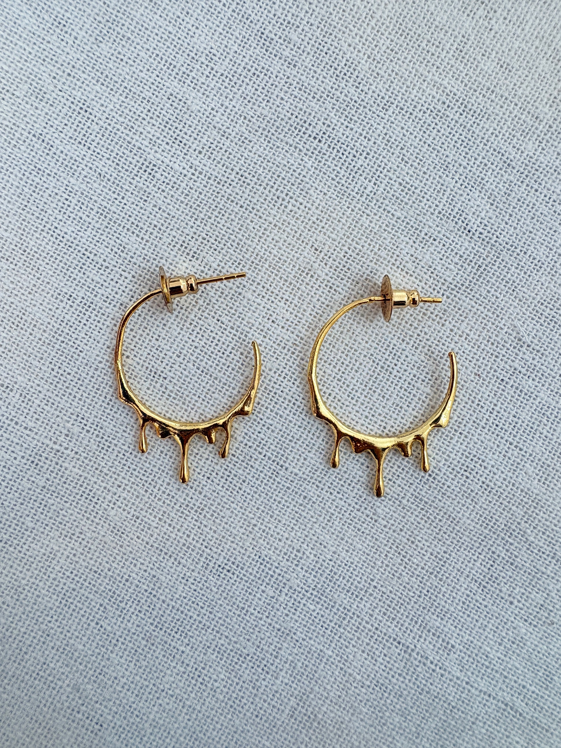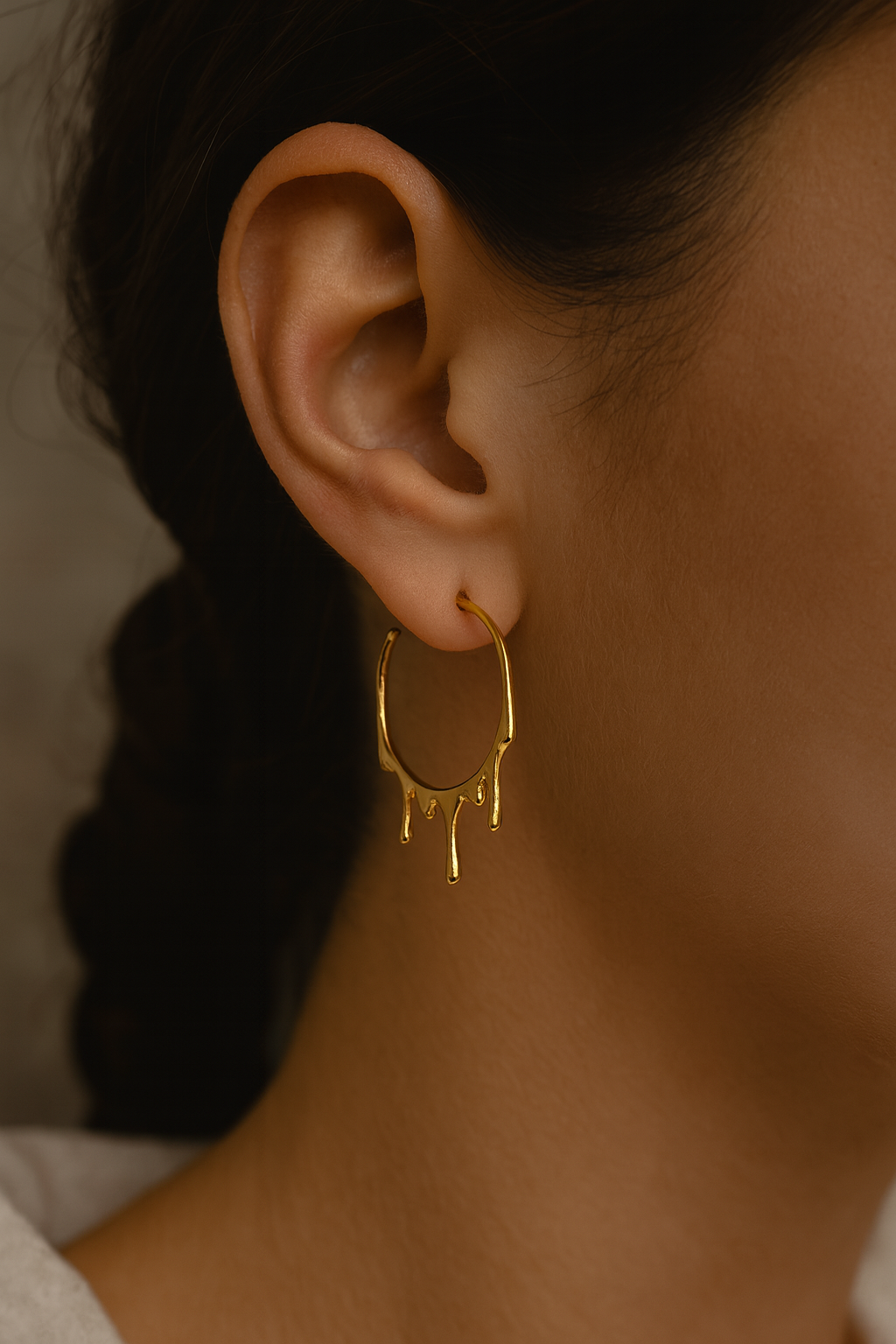 Molten gold-inspired hoops in 18K gold-plated brass, crafted to last.