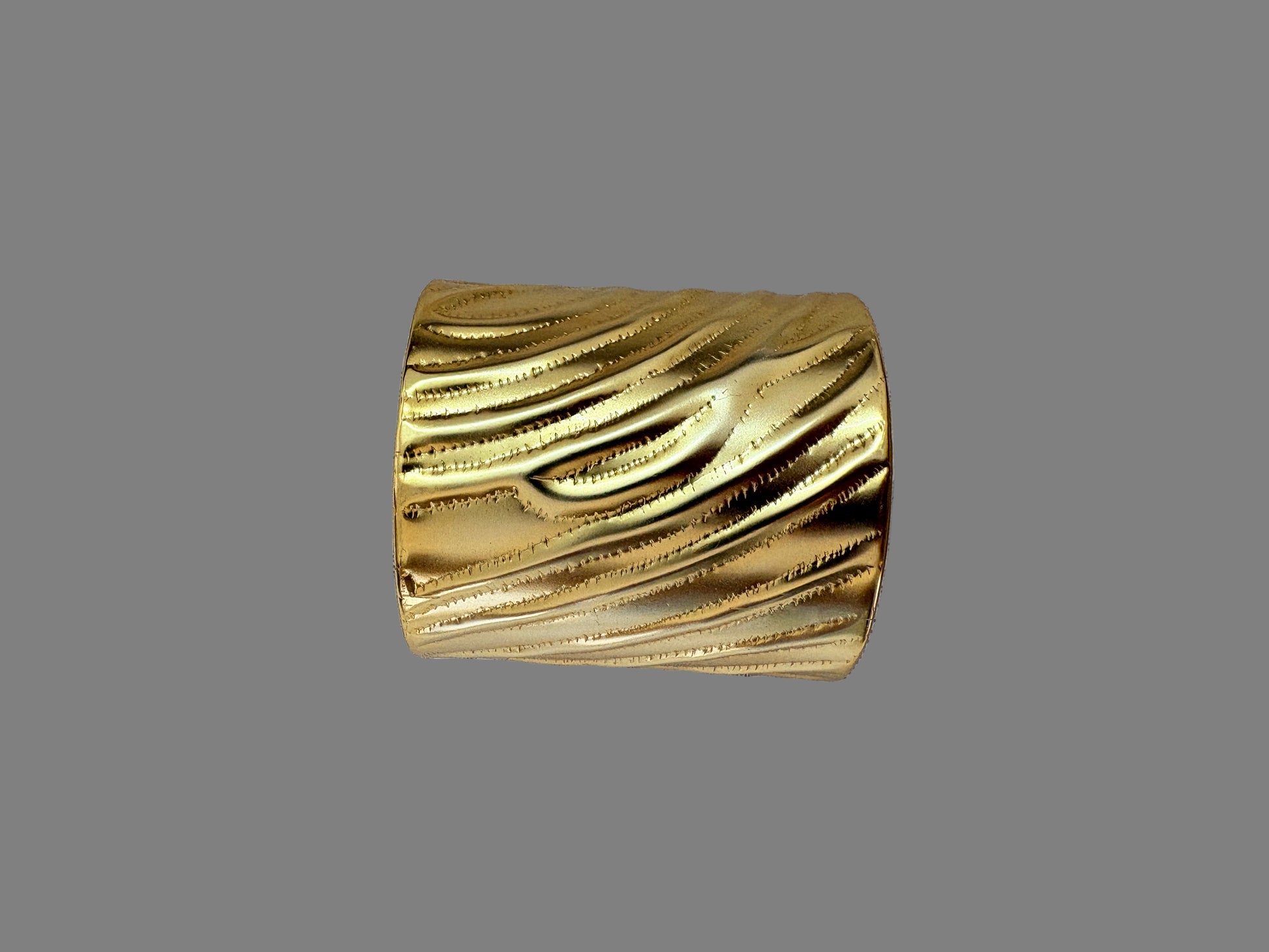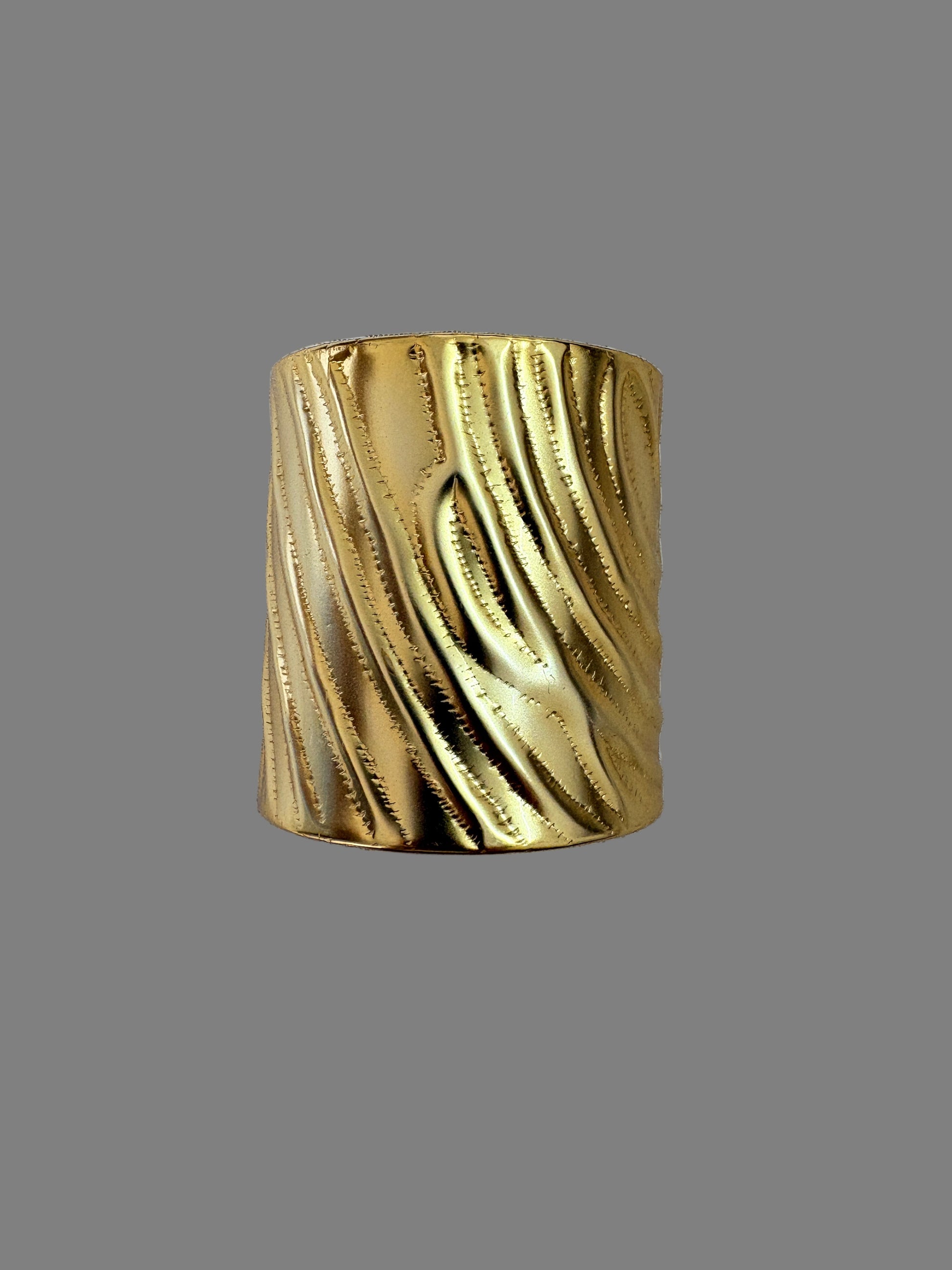 Zyara – A bold gold cuff with fluid, wave-like textures that capture the light from every angle. Its sculpted form exudes strength and sophistication, making it the perfect statement piece to elevate both minimal and opulent looks.